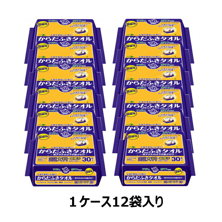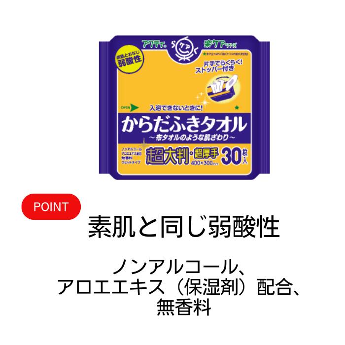 【ケース販売】清拭用品 アクティ 楽ケアシリーズ からだふきタオル 超大判・超厚手30枚×12袋入り 40×30cm ノンアルコール アロエエキス配合 無香料 弱酸性 ウェットタイプ 布タオルのような肌触り (日本製紙クレシア)