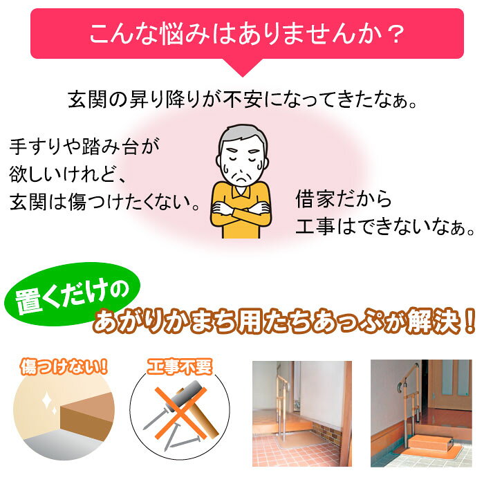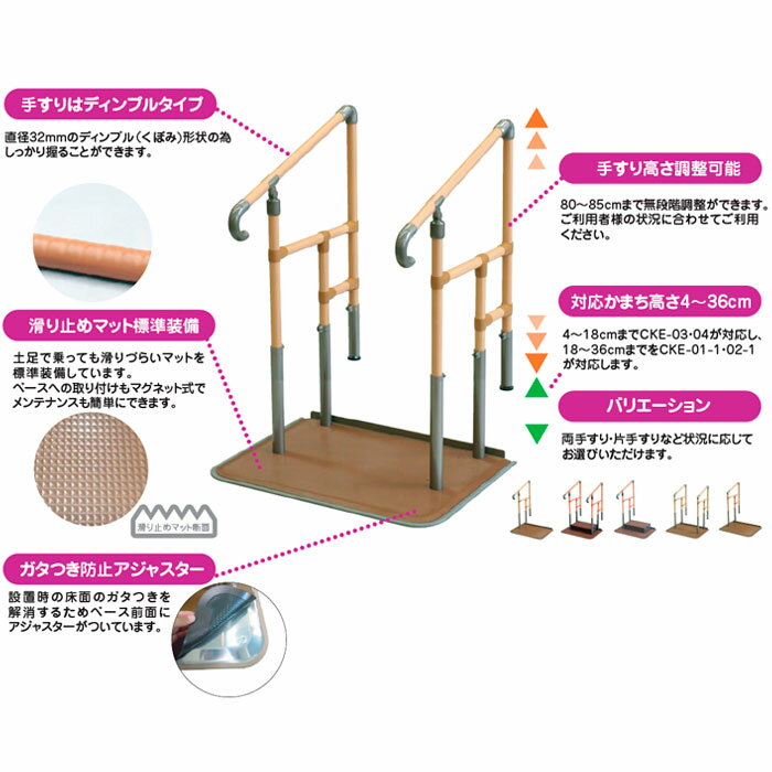 ※メーカー直送商品となります。 玄関に置くだけで補助手すりが構築でき、あがりかまちの昇降をサポートします。 対応するあがりかまちの高さは18~36cm。 ディンプル(くぼみ)付きで握りやすい、直径3.2cmの手すりを採用しています。 手すりの高さはあがりかまちの上から80~85cmまで、無段階の調整が可能です。 土足で乗っても滑りにくいマットを標準装備しています。 またベース前後左右2ケ所についているアジャスターで、使用時のがたつきを防止できます。 【手すり】 外寸法:幅78×奥行56cm×手すり高さ80~85cm あがりかまち高さ:18~36cm 手すり太さ:φ32mm ベース厚さ:1.5cm 重量:26.9kg> 【ステップ台】 外寸法:幅50×奥行30cm 高さ調整:12・14・16・18cm(2cmピッチ、4段階) 重量:6.9kg 重量:26.9kg(CKE-02-1 ステップ台なし) 重量:33.8kg(CKE-02 ステップ台付き) 材質 手すり:プラスチック被覆スチールパイプ、アルミ合金(ジョイント) スタンド:ステンレス ベース:ステンレス、ゴム(縁部) マット:プラスチック ステップ台:スチール(CKE-B) メーカー:矢崎化工株式会社両手すり(CKE-01)はこちら