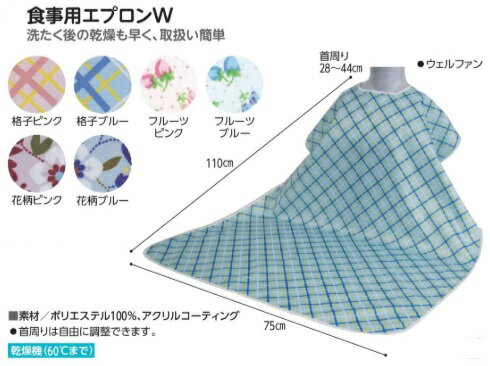 ウェルファン【メール便対象品】全国送料無料 食事用エプロンW 格子ピンク/格子ブルー/花柄ピンク/花柄ブルー/フルーツピンク/フルーツブルー 介護 食べこぼし 高齢者
