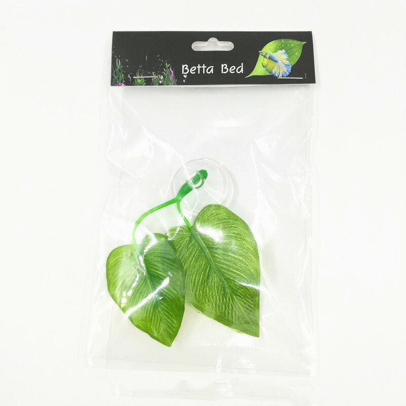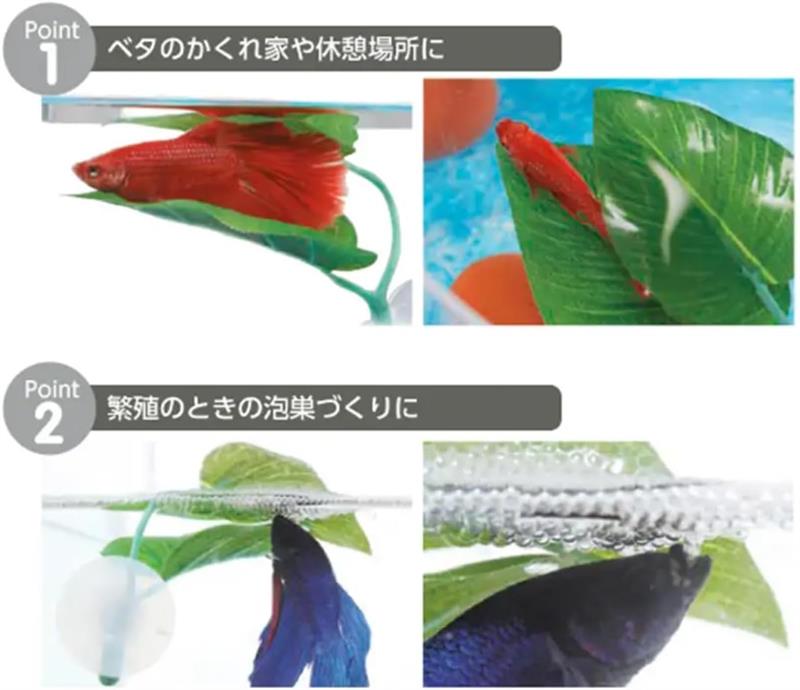 ベタが安心して隠れたり休んだりできるリーフ形状の隠れ家 吸盤付きで、水槽内の好きな位置に取り付け可能 水面近くに設置すると、オスが泡巣作りのベースに利用 サテン生地とPE製のリアルな質感