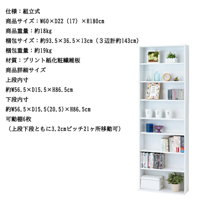 クロシオ 文庫本棚W600 Sの特徴 ■奥行は本体部分約17cm、地板約22cmと薄型設計ですので、圧迫感がなく、 ■CDやDVD、文庫本などをサイズに合わせて、たっぷり収納できます。 ■商品名 文庫本棚W600 S ■サイズ W60×D22(17)×H180cm ■重量 約18kg ■材質 プリント紙化粧繊維板 ■梱包サイズ(3辺計) 約93.5×36.5×13cm(3辺計約143cm) ■梱包重量 約19kg ■商品詳細サイズ 上段内寸約W56.5×D15.5×H86.5cm下段内寸約W56.5×D15.5(20.5)×H86.5cm 可動棚6枚(上段下段ともに3.2cmピッチ21ヶ所移動可) ■仕様 組立式 ■生産国 ベトナム ■クロシオ 文庫本棚の関連商品はこちら クロシオ 文庫本棚 W450 Sはこちら クロシオ 文庫本棚 W600 Sはこちら
