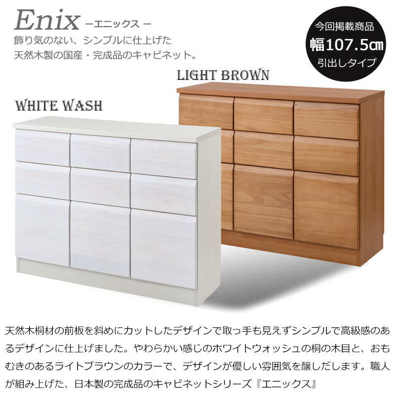 ■商品について/天然木桐材の前板を斜めにカットしたデザインで取っ手も見えずシンプルで高級感のあるデザインに仕上げました。やわらかい感じのホワイトウォッシュの桐の木目と、おもむきのあるライトブラウンのカラーで、デザインが優しい雰囲気を醸しだします。職人が組み上げた日本製の完成品『エニックス』キャビネットシリーズ。スクエアキャビネットの扉内は、A4もスッポリと収納する事ができます。色んな物がスペース別に収納できるのでしっかりと整理ができて大変便利です。扉内はコード穴が付いており、ルーターや電源タップ、ゲーム機などを収納して配線もできるのが便利。使う時だけワンプッシュで扉を開けて、使い終われば目隠しの扉で収納してスッキリします。機能性と美観のあるキャビネットでお洒落に便利に活用できます。なんでも収納できる扉タイプ、仕分けしやすい引出し付きタイプ、ダイニングサイドでこどもが勉強できるデスクタイプと使い方自在。■商品の仕様/前板:天然木桐材(ウレタン樹脂塗装)、天板:強化プリント紙化粧繊維板、その他:プリント紙化粧繊維板■商品サイズ/本体:(約)幅107.5×奥行35.5×高さ83cm■引出内寸/(約)幅27×奥行28.5×深さ11(有効13.5)cm■扉内寸/(約)幅32×奥行31.5×高さ33(マグネット下32)cm■耐荷重量/天板:(約)15kg■商品重量:(約)32kg■日本製■完成品" →販売ページはこちら →販売ページはこちら →販売ページはこちら →販売ページはこちら ---------------------- →販売ページはこちら →販売ページはこちら →販売ページはこちら →販売ページはこちら →販売ページはこちら