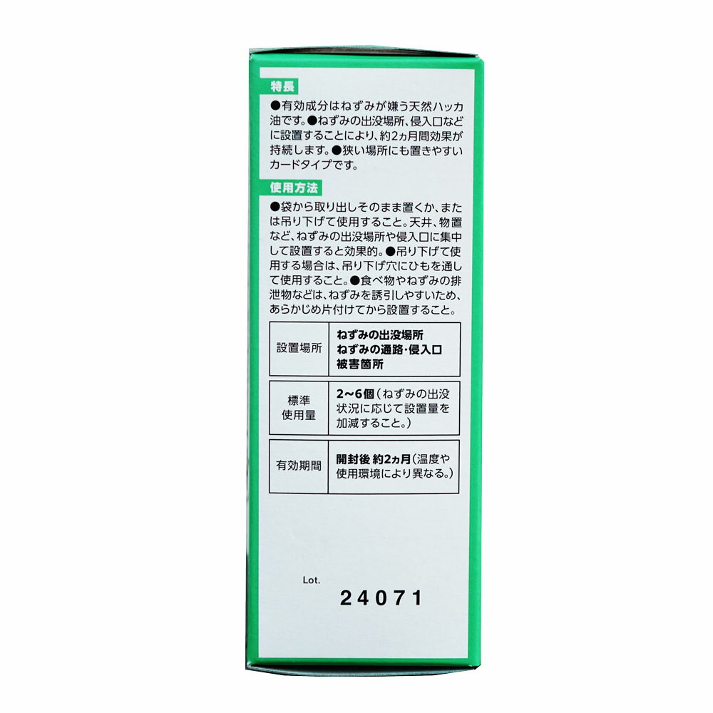 商品名 天然ハーブねずみハッカー(ねずみよけ) 内容量 50g(25gx2個)/箱 ×4箱 有効成分 天然ハッカ油 設置場所 ねずみの出没場所、ねずみの通路、侵入口、被害箇所 設置場所:個数 一般家庭: 2~6個 飲食、厨房関係など被害の多い場所:2個/5㎡ 電気設備、倉庫、事務所など被害の少ない場所:2個/10㎡ 有効期限 開封後約2カ月 販売元 アース製薬株式会社 ●商品特長 ◆有効成分はねずみが嫌う天然ハッカ油です。 ◆ねずみの出没場所、侵入口などに設置することにより、約2カ月間忌避効果が持続します。 ◆狭い場所に置きやすいカードタイプです。 ※置いても吊るしても使えるカードタイプ!吊るす場合はひもを取り付けてください。 【使用場所】厨房/工場/倉庫・畜舎・排水溝/ビル 等 ●使用方法 ◆袋から取り出しそのまま置くか、または吊り下げて使用してください。天井、物置、台所、流しの下など、ねずみの出没場所や侵入口に集中して設置すると効果的です。 ◆吊り下げて使用する場合は、吊り下げ穴にひもを通して使用してください。 ◆食べ物やねずみの排泄物などは、ねずみを誘引しやすいので、あらかじめ片付けてから設置してください。 ※ねずみの出没状況に応じて設置量を加減してください。 ※パッケージは予告なく変更されることがあります。