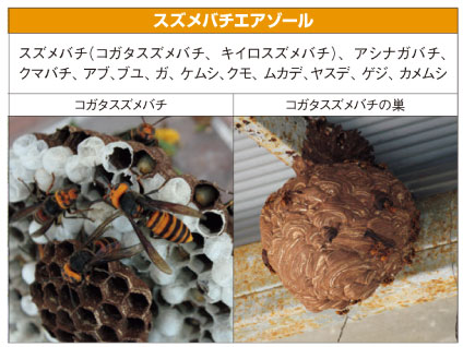 商品名 スズメバチエアゾール 内容量 480ml 有効成分 モンフルオロトリン・メトフルトリン・シラフルオフェン 保証票の種類 生活害虫防除剤協議会登録 剤 型 エアゾール剤 販売元 KINCHO園芸株式会社 ●商品特長 ◆プロも認める優れた効果。庭木でも、植物にやさしい。羽ばたき止めて激撃ち退治! ◆効退治&羽ばたき停止:飛びまわるハチを行動停止させ、速効退治します。 ◆巣の処理:すぐれた殺虫成分で巣をまるごと処理できます。 ◆巣作り防止3ヵ月※:あらかじめ散布して巣を作らせない営巣防止作用もあります。 ※環境により異なります。 ●使用方法 ◆トリガー上部のスライドロックを「使用時」側にスライドさせるとトリガーが引けるようになります。「ロック」側にスラ イドさせるとトリガーが引けなくなります。ノズル上部を強く押さないでください。またロックされた状態で無理にトリガーを引かないでください。破損、誤噴射のおそ れがあります。 ◆連続35秒間で全量が噴射されます。 ●適用害虫 スズメバチ(コガタスズメバチ、キイロスズメバチ、ツマアカスズメバチ)、アシナガバチ、クマバチ、アブ、ブユ、ガ、ケムシ、クモ、ムカデ、ヤスデ、ゲジ、カメムシ ●ハチを退治する場合 ◆ハチから3m程度離れた所で風上から風下に向かって噴射します。ただし噴射が風の影響を受ける場合は使用をさけてくだ さい。 ◆薬剤のかかったハチは直ちに攻撃性をなくし、その場に落下する場合もありますが、逃げた先で死ぬ場合もあります。 ◆缶を逆さにして使わないでください。ガスだけが出てしまい、全量を噴射できなくなる場合があります。 ◆ハチは死んでも反射的に刺すことがありますので、退治されたハチも決して素手でさわらないでください。散布時は農薬用 マスク、手袋、長ズボン・長袖作業衣などを着用してください。 ●スズメバチの巣の処理をする場合 ◆巣を処理する場合は、必ず皮ふの露出しない防護服、手袋、長靴、保護メガネ(いずれもハチの針が皮膚までとどかないも の)を着用し、日没後に行ってください。 ◆巣に振動を与えないように注意してください。 ◆使用する本剤は必ず未使用のものを用い、使いきってください。また予備としてもう1本以上の本剤を用意してください。 ◆巣にゆっくり近づき、3m程度離れた所から噴射しながら、さらに巣に近づきながら、確実に巣穴の中に10秒以上噴射し てください。 ◆処理後の巣は放置せず、土に埋めるなど、すみやかに処分してください。なお、外にいたスズメバチが戻ってくる場合があ るので、巣の処分は防護服、手袋、長靴、保護メガネを着用したままで行ってください。 ◆直径が25cmを超える大きな巣の処理や、巣穴に噴射するのが困難な場合(生け垣の中、木の「うろ」、屋根裏、地面の 中に巣があるオオスズメバチの場合など)の処理は大変危険ですので、専門の防除業者にご相談ください。 ◆万一、スズメバチに刺された場合は直ちに医師の手当を受けてください。 ●使用上の注意 ◆室内では使用しないでください。また屋根裏等の換気の十分に出来ない場所では使用しないでください。 ◆屋外でも火の気がある付近では使用しないでください。 ◆体調のすぐれない時の噴射はさけてください。人体に向けて噴射しないでください。 ◆誤飲、吸入などのないよう注意してください。誤飲の場合、または使用中に身体に異常を感じた場合は直ちに医師の手当を 受けてください。 ◆ハチに刺された場合は直ちに医師の手当を受けてください。 ◆ハチにアレルギー体質の方はハチの巣の駆除はもちろん巣の側にも近づかないよう注意してください。 ◆本剤は噴射力が強く多量の噴射液が遠くまで飛ぶので取扱に十分注意してください。 ◆薬剤によってアレルギー症状が出る人、かぶれやすい体質の人、喘息の症状のある人、病人、妊婦、乳幼児等のいる場所で は使用しないでください。 ◆本剤を使用する際は必ず防護服、手袋などを着用し、なるべく皮膚の露出を少なくし、噴射液を浴びないようにしてくださ い。特にハチの巣を処理する場合は、必ず日没後に行い、皮膚の露出しない防護服、手袋、長靴、保護メガネ(いずれもハチ の針が皮膚までとどかないもの)を着用してください。 ◆風上から噴射するなどして、噴射液を吸い込んだり浴びたりしないように注意してください。眼に入ったら、すぐに水洗し 、眼科医の手当を受けてください。作業後は直ちに手足、顔などを石けんでよく洗い、うがいをしてください。 ◆本剤の有効成分は速効性ですが、薬剤が十分かからないと効果が不十分になるので注意してください。 ◆薬剤のかかり具合が不十分なハチや死角にいるハチは危険なので十分注意してください。 ◆ミツバチにも影響を及ぼすので注意してください。 ◆噴射場所の近くは液がしたたり落ちるので注意してください。 ◆噴射時及び噴射当日は噴射区域に小児やペットが立ち入らないように配慮してくだ