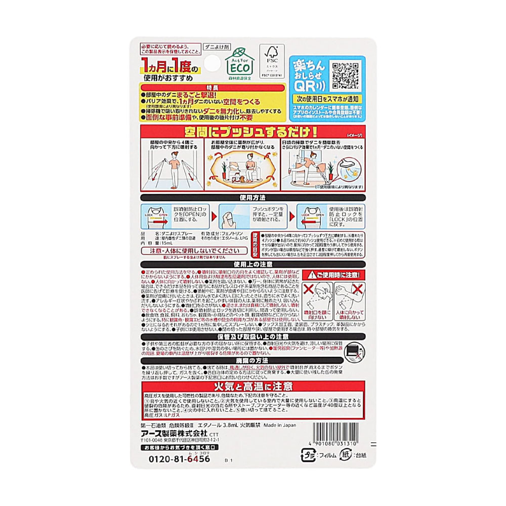 商品名 ダニアース 1プッシュ式スプレー 60プッシュ 内容量 15ml×3個 生産国・生産地域 日本 有効成分 フェノトリン 成 分 エタノール、LPG 効果・効能 屋内塵性ダニ類の忌避 効果持続期間 約1ヵ月(使用環境により異なります) 販売元 アース製薬株式会社 ●商品特長 ◆部屋中のダニまるごと撃退! ◆バリア効果で、1ヵ月ダニのいない空間をつくる。(使用環境により異なります) ◆掃除機で吸い取りきれないダニを無力化し、除去しやすくする。 ◆面倒な事前準備や、使用後の後片付け不要。 ◆空間にプッシュするだけ ・部屋の中央から4隅に向かって下方に噴射する。 ・お部屋全体に薬剤が広がり、部屋中のダニが寄り付かなくなる。 ・日頃の掃除でダニを簡単除去。さらにバリア効果で1ヵ月※ダニのいない空間をつくる。(※使用環境により異なります) ◆赤ちゃん・ペットがいるご家庭にも。低刺激。窓を開けたままでもOK! ◆Act For ECO 再生プラ使用、森林資源保全 ◆楽ちんおしらせQR 次の使用日をスマホが通知 スマホのカレンダーに簡単登録。会員登録は不要。 (お使いの機器によっては動作しないことがあります。) ●使用方法 (1)誤噴射防止ロックを「OPEN」の位置にする。 (2)プッシュボタンを押すと、一定量が噴射される。 (3)使用後は誤噴射防止ロックを「LOCK」の位置に戻す。 【使用の目安】 ◆部屋の中央から4隅に向かって、1プッシュずつ下方に噴射る。(6畳あたり4プッシュ) ◆本品15mlで約60プッシュ使用できる。 ※初めて使用する際は十分な量が出ないので、屋外に向かって2回程度カラ押ししてから使用する。ボタンが固い場合は親指などで強く押す。過度に傾けて噴射しない。ボタンを押しても出にくい場合は、缶を正立させて2回程度押してから再度使用する。 注意-人体には使用しないこと 肌にスプレーする虫よけ剤ではありません。 ●使用上の注意 必要に応じて読めるよう、製品表示を保管しておくこと。 ◆定められた使用方法を守る。 ◆噴射前に噴射口の方向をよく確認して、薬剤が顔などにかからないようにする。 ◆人体用虫よけ剤(塗布型忌避剤)ではないので、人体には使用しない。 ◆人体に向かって噴射しない。 ◆薬剤を吸い込まない。 ◆万一、身体に異常が起きた場合は、できるだけ本品を持って直ちに本品がピレスロイド系薬剤を含む商品であることを医師に告げて診療を受ける。 ◆噴射中に、薬剤が皮膚や目にかからないように注意する。 薬剤が皮膚に付いたときは、石けん水でよく洗い、目に入ったときは、直ちに水でよく洗い流す。 ◆アレルギー症状やかぶれを起こしやすい体質の人は、薬剤に触れたり、吸い込んだりしないようにする。 ◆噴射口をふさがない。 ◆逆さま、または真横にして噴射しない。噴射できなくなることがある。 ◆誤噴射防止ロックを適切に利用し、間違って使用しない。 ◆飲食物、食器、飼料、おもちゃ、観賞魚・小鳥などのペット類、観賞植物などにかからないようにする。特に観賞魚・観賞エビ等の水槽や昆虫の飼育カゴがある部屋では使用しない。 ◆シミになるおそれがあるので1ヵ所に集中してスプレーしない。 ◆ワックス加工面、塗装面、プラスチック、革製品にかからないようにする。 ◆子供には使用させない。 ◆閉め切った部屋や狭い部屋で使用する場合は、時々部屋の換気をする。 【保管及び取扱い上の注意】 ◆子供や第三者の監督が必要な方の手の届かない所に保管する。 ◆直射日光や火気を避け、涼しい場所に保管する。 ◆缶のさびを防ぐため、水回りや湿気の多い場所には置かない。 ◆暖房器具(ファンヒーター等)や加熱源の周囲、夏場の車内は温度が上がり破裂する危険があるので置かない。 【廃棄の方法】 ◆本品は使い切ってから捨てる。 ◆捨てる時は、風通しが良く、火気のない屋外で噴射音が消えるまでボタンを繰り返し押して、ガスを抜く。 ◆各自治体の定める方法に従って廃棄する。 ◆大量に使い残した缶の廃棄方法はお手数ですがアース製薬お客様からお気づきを頂く窓口にお問い合わせください。 <火気と高温に注意> 高圧ガスを使用した可燃性の製品であり、危険なため、下記の注意を守ること。 (1)炎や火気の近くで使用しないこと。 (2)火気を使用している室内で大量に使用しないこと。 (3)高温にすると破裂の危険があるため、直射日光の当たる所やストーブ、ファンヒーター等の近くなど温度が40度以上となる所に置かないこと。 (4)火の中に入れないこと。 (5)使い切って捨てること。 高圧ガス:LPガス 火気厳禁 ※パッケージは予告なく変更されることがあります。