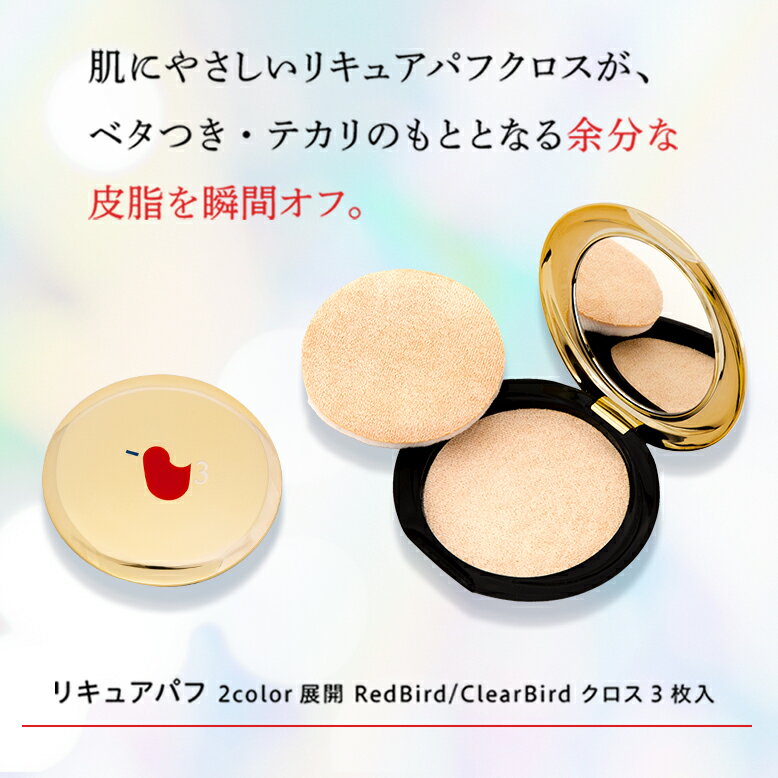 広告文責 メーカー名 株式会社サンパック (所在地)大阪府吹田市江坂町1-17-14 (電話番号)0120-528-389 サイズ 幅82mm × 奥行き77mm × 高さ15mm 内容 コンパクト:1個、クロス:3枚、パフ:1個 ※ファンデーションではありません。 重量 約49g カラー クリアバード、レッドバード * *画面上と実物では多少色具合が異なって見える場合もございます。ご了承ください。 材質 コンパクト/ABS・ガラス・ステンレス クロス/ポリエステル パフ/ポリエステル・ポリウレタン PETシーラー/PET 製造国 日本製 特徴 朝メイク復活。瞬間さらさら肌 ・朝メイク復活/気になるベタつき、テカリを瞬間オフ ・お直しスムーズ/メイクオフせずに肌の状態を整える ・しっかり下地肌/メイク前の余分なオイルオフ、ミスしたアイブロウのお直しにも ・洗ってくり返し使えるクロス/クロスが汚れたら、中性洗剤で軽く手洗いしてください。くり返し使えます(推奨は5回) 皮脂の吸収力がすごい/超極細繊維ナノフロント®(帝人フロンティア(株)製)を使用した”リキュアパフクロス”は、肌に優しく、繊維の毛細管現象と吸着作用により、すぐれた皮脂吸収性能を発揮します。 メイクが崩れにくい/やわらかいパフで押さえるから、肌に力がかかりすぎずファンデやチークが崩れにくい 使用上の注意 ・クロスを汚れたままにしておくと、変色やいたみが早くなる場合がありますので、清潔にしてお使いください。 ・連続使用回数は個人差がありますので、吸収力が弱くなったと感じたらクロスを洗うまたは、新しいものと交換してください。 ・クロスやパフが汚れたら中性洗剤で軽くもみ洗いし、よくすすいでから陰干ししてください。 ・洗浄後しわがひどい場合は、必ずあて布をして低温でアイロンをかけてください。 ・洗浄して使い続けるうちに皮脂取り効果・パフへの付きが悪くなりますので、効果の低下を感じたら新しいものと交換してください。 ・使用時は、クロスで肌をこすらず、軽く押さえてください。 ・用途以外の使用はしないでください。 ・火気に近づけないでください。 ・乳幼児の手の届かない場所で保管してください。 ・傷や腫れもの、湿疹等異常のあるときは使用しないでください。 ・使用中、肌に異常がみられた時は、直ちに使用を中止してください。 配送方法 メール便(4個まで)または宅配便
