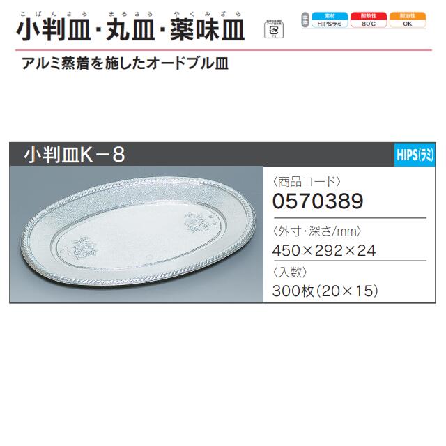 商品名 小判皿 K-8 商品コード 0570389 外寸・深さ(mm) 450×292×24 ケース入数 300枚 袋入数 20枚 素材 HIPS(ポリスチレン) メーカー 福助工業株式会社 販売者 株式会社梶本 小判皿・丸皿・薬味皿 ~アルミ蒸着を施したオードブル皿~ ※本品はメーカー直送品になります。 注意点をご確認の上、ご注文をお願い致します。 本品以外の 「弁当容器」や「どんぶり」、「トレー」、「透明容器」はこちらから ・食品容器取り扱い上の注意 ・素材説明安心の国産!国内メーカー・国内生産です。 小判皿・丸皿・薬味皿シリーズ:アルミ蒸着を施したオードブル皿 本ページの商品以外についても、福助工業のカタログ掲載品・ケース単位であれば 全品(「関連商品」除く)取り扱い可能! 楽天のページが見つからなくても、お気軽にお問合せ下さい!