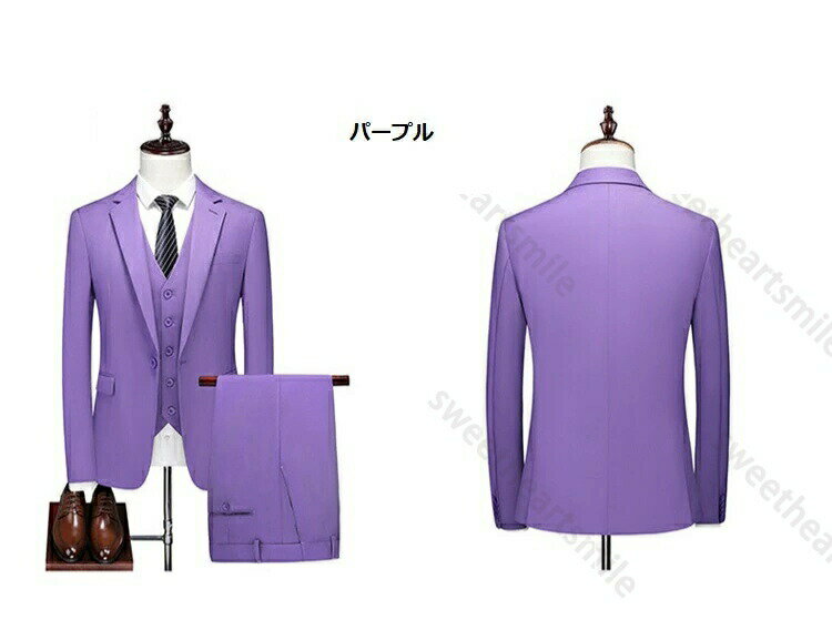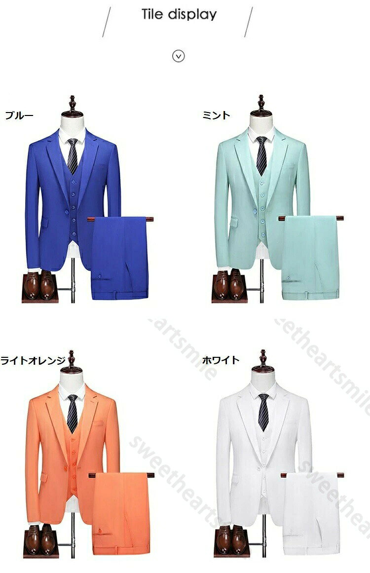 実寸 商品写真の下にあるサイズ表をご覧ください 当商品販売内容 3点セット:ジャケット+ベスト+ズボン カラー展開 ブルー/ミント/ライトオレンジ/キャメル/ブラック/ダークオレンジ/レッド/ライトブルー/パープル紫/ホワイト白/ 素材 80ポリエステル% 20レーヨン% 厚み 普通 商品仕様 ●ジャケット仕様:一つボタンシングルスーツ*ノチッドラペル*フラックポケット*サイドベンツ*総裏仕立て ●ベスト仕様:5つボタンシングルベスト*尾錠付き*V字型襟*腰左右ポケットあり ●スラックス仕様:ノータック