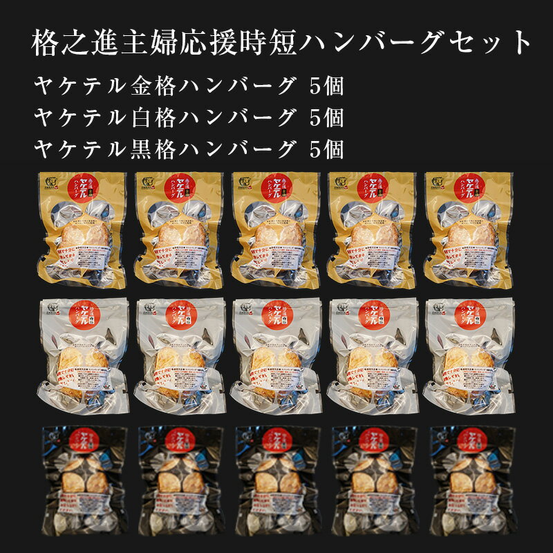 原材料・内容量・保存方法など 原材料 ヤケテル金格ハンバーグ 食肉(豚肉(国産)、牛肉(国産)、ソテードオニオン(玉葱)、つなぎ(鶏卵、パン粉(小麦を含む)、牛乳)、牛脂(国産)、塩麹(米、米麹、食塩)、食塩、香辛料、オニオンエキス ヤケテル白格ハンバーグ 食肉(牛肉(国産黒毛和牛)、豚肉(岩手県産)、ソテードオニオン(玉葱)、つなぎ(鶏卵、パン粉(小麦を含む)、牛乳)、塩麹(米、米麹、食塩)、食塩、香辛料、オニオンエキス ヤケテル黒格ハンバーグ 牛肉(国産黒毛和牛)、ソテードオニオン(玉葱)、つなぎ(鶏卵、パン粉(小麦を含む)、牛乳)、塩麹(米、米麹、食塩)、食塩、香辛料、オニオンエキス 内容量 ヤケテル金格ハンバーグ(5個セット) 120g/1個 5個入り 合計600g ヤケテル白格ハンバーグ(5個セット) 120g/1個 5個入り 合計600g ヤケテル黒格ハンバーグ(5個セット) 120g/1個 5個入り 合計600g 保存方法 冷凍 保存方法: -18℃以下で保存 賞味期限: 製造日より180日(冷凍保存) 期限まで最も短いもので60日以上の商品をお届けしております。 賞味期限は-18℃以下、未開封で保存した場合の期限です。 解凍後はなるべく早くお召し上がりください。 使用しているアレルギー物質 ヤケテル金格ハンバーグ 豚肉・牛肉・卵・小麦・乳 ヤケテル白格ハンバーグ 豚肉・牛肉・卵・小麦・乳 ヤケテル黒格ハンバーグ 牛肉・卵・小麦・乳格之進主婦応援時短ハンバーグセット内容 ヤケテル金格ハンバーグの特徴 厳選した国産牛肉と白金豚の『格之進 黄金ブレンドレシピ』による奥深い味わい。 格之進こだわりの 金格ハンバーグを焼き上げた後に急速冷凍したハンバーグです。 湯煎するだけで調理手間いらず。料理嫌いの方や独身男性の方でも美味しいハンバーグが簡単に食べられます。 溢れ出る肉汁は一度味わったら忘れられない味で、ソースなしでも食べられるリピーター続出の一品です。 通常品と異なり焼成済みですので、湯煎するだけで食べることができます。BBQでも生焼けの心配もなく炭火で温めて二度焼きも美味♪ ヤケテル白格ハンバーグの特徴 黒毛和牛と白金豚のハイクオリティブレンドのジューシーなまろみ。 白格ハンバーグは「黒毛和牛」と「白金豚」を使用した合挽きハンバーグです。 黒格ハンバーグに比べ、比較的あっさりとした味わいで、特に女性の方に人気のある商品です。 通常品と異なり焼成済みですので、湯煎するだけで食べることができます。BBQでも生焼けの心配もなく炭火で温めて二度焼きも美味♪ ヤケテル黒格ハンバーグの特徴 黒毛和牛100%ストレートの爽快な美味さと円熟したコク。 格之進の肉職人によって厳選された黒毛和牛を100%贅沢に使用しております。 お肉をしっかりと感じることが出来る挽肉から溢れだす肉汁は、あっさりとして口どけが良く旨みだけを残して、スゥーと消えていきます。 湯煎するだけで調理手間いらず。料理嫌いの方や独身男性の方でも美味しいハンバーグが簡単に食べられます。 溢れ出る肉汁は一度味わったら忘れられない味で、ソースなしでも食べられるリピーター続出の一品です。 通常品と異なり焼成済みですので、湯煎するだけで食べることができます。BBQでも生焼けの心配もなく炭火で温めて二度焼きも美味♪