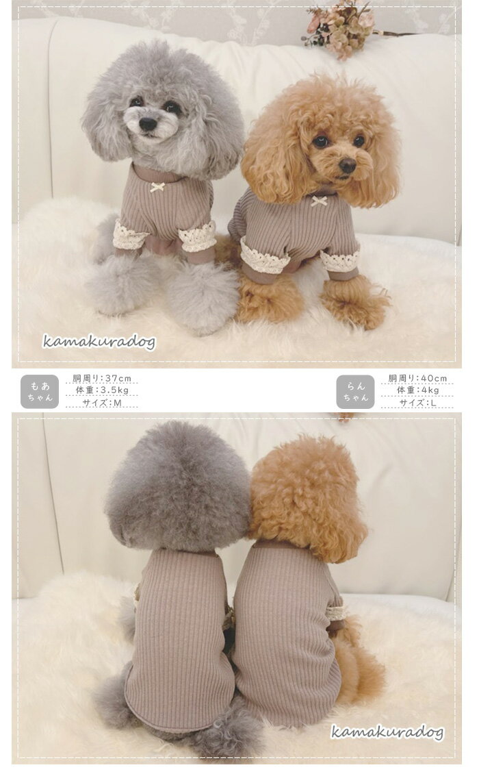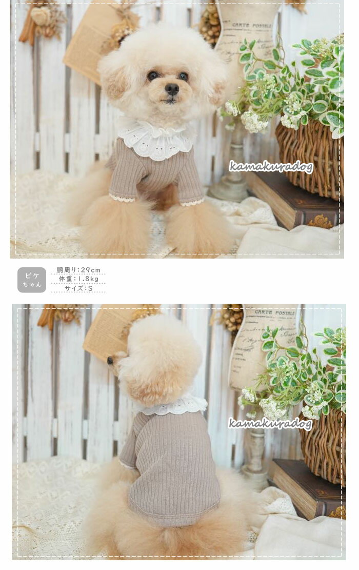 犬/犬服/犬の服/服/ドッグウェア/ドッグ/ウェア/dogwear/ペット/ペット服/ペット用服/ 小型犬/小型犬用品/子犬/犬用ウェア/かわいい服/人気/おしゃれ/チワワ/トイプードル/ トイプー/マルチーズ/ポメラニアン/ポメ/ヨークシャテリア/ヨーキー/マルチーズ/ミックス犬 ダックス/シーズー/春/夏/秋/冬/春夏/秋冬/トイプードル 服 冬/トイプードル 服/子犬/ チワワ 服/チワワ グッズ/パピヨン の 服/犬 服 シーズー/犬 服 かわいい/犬 服 おしゃれ/ トップス/犬 春服/犬 夏服/犬 秋服/犬 冬服/キルト/スナップ/ボタン/重ね着/バッジ/*デザインによって、生地の色に若干の誤差が生じる場合がございます。写真をご参考ください。 1. 伸縮性のあるリブ素材で快適な着心地。 2. 袖レースタイプは、繊細なレースが袖口レースがポイント。 3. 襟フリルタイプは、ボリュームフリルが可愛らしさを引き立てるデザイン。 *素材:綿63%+ポリエステル37% 袖レースタイプは、首周りのハイネック部分は着丈に含まれておりません。 胴周り(襟タイプ) 胴周り(袖タイプ) 着丈 体重 S 30 32 22 約2kg M 36 38 25 約3.5kg L 44 44 29 約5.5kg XL 48 49 32 約8kg ※上記に記載しております表はお洋服の実寸です。(2〜3cmほどの誤差はございます。) 洋服のデザイン、また愛犬の個体差や毛量によって若干サイズが異なる場合がございますので、事前にワンちゃんのサイズを測った上でご検討下さい。 ※ご覧の環境によっては実物と色味が異なる場合がございます。あらかじめご了承くださいませ。