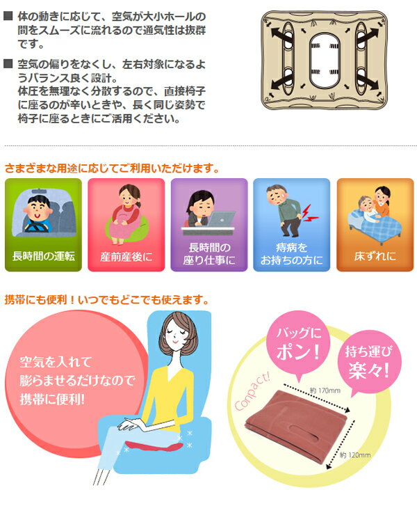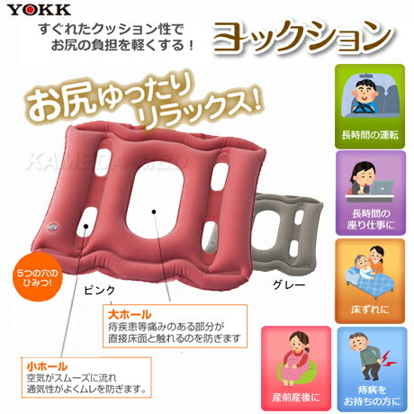 「ヨックション」は空気クッションなのでお好きな場所で空気を吹き入れたらすぐにお使いになれます。カラーはグレーとピンクの2色からお選び頂けます! ●通気性にすぐれオフィスにヘルシーライフをお届けします。 ●オフィスレディや、むれやすい方に。 ●長時間イスに座って仕事をする方に。 ●体の痛む部分を保護したいときに。 ●2つに折って腰痛保護クッションとして。 【使用時サイズ】縦38×横40cm×厚さ6cm