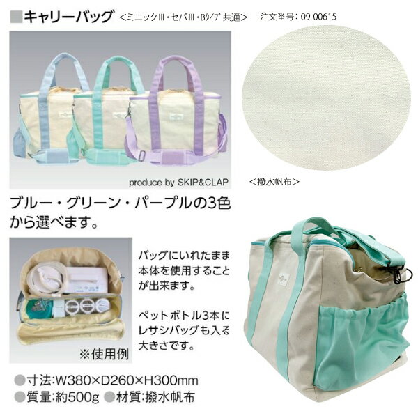 バッグにいれながら本体を使用することができます。 ミニックIIIシリーズのパステルカラーと同じブルー、グリーン、パープルの3色をご用意しています。 吸引器とお揃いにしても、お好きなカラーをお選びいただいてもOK。 ○必要なものが一まとめに! ○入れたまま充電! ○裏表撥水加工! ○肩掛けも可能! <対象機種> ミニックIII-S、ミニックIII-SD、ミニックIII-SB、ミニックIII-W、ミニックIII-WD、ミニックIII-WB、 セパ-III、セパIII-D、セパIII-B、ミニックDC-II、ミニックS-II、ミニックW-II、セパDC-II、セパII メーカー品番 ブルー:200191842 グリーン:200191841 パープル:200191843 サイズ等規格 寸法:W380×D260×H300mm 質量:約500g 材質:撥水帆布