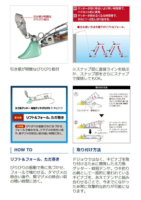 引くだけで強い振動が出る“びりびり板”を装着した、太刀魚ゲッターびりびり。キビナゴにルアー的な振動アクションを与えるため、時合いを外した日没以降や真っ暗な夜明け前など、太刀魚が目で見て追いにくい時間帯にこそ真価を発揮します。単に引き続けるよりも、軽くシャクりを交えながら中層を超スローで探るのが効果的。引いて喰うならノーマルの太刀魚ゲッター、沈める最中に喰うならびりびり、と使い分けるのがオススメです。 ■カラー:01Tナチュラルグロー ■サイズ:3号/11g ■ステンレス製オリジナルフック ※サイズが合わないなど、お客様都合での返品はご遠慮くださいますようお願いいたします。 画像は商品イメージです。 販売商品の代表画像となりますので型番などの仕様に一致しない場合があります。 お使いのモニターによりましては、実際のカラーイメージと異なって見える場合があります。かめや kameya ルア ーシマノ 太刀魚 タチウオ テンヤ 太刀魚ゲッター