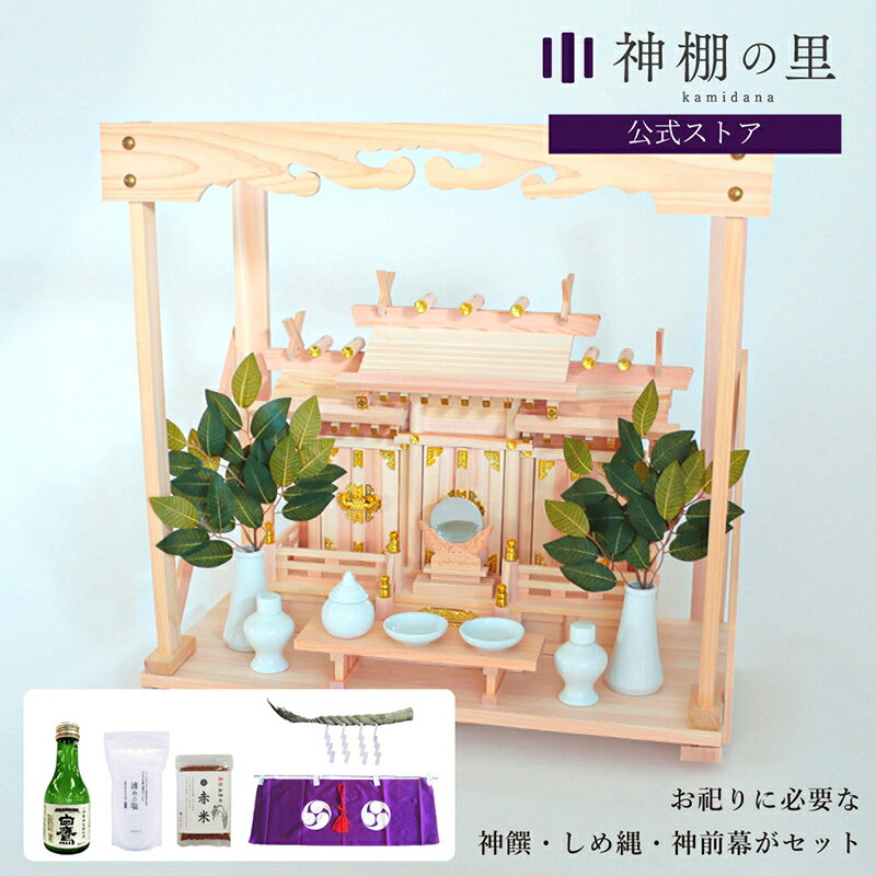 神棚 通し屋根三社造り[木曽ひのき 高級神棚 総国産 内祭 お宮] 商品説明 サイズ 外寸 高さ40cm×幅68cm×奥行き21cm 内寸 大扉・高さ32.5cm×幅42cm×奥行き4cm 天照大神宮のお札(高さ24.5cm×幅6.8cm)が入ります。 重量 約3.0kg お札の納め方の仕様 扉枠はずし 扉部分を外して納めることができます。 大扉・小扉は通しになっています。 底抜き 神棚の床下部分にくぼみがあり御札をさせるようになってます。 安心の品質、国産神具 伝統を受け継いだ職人が、腕によりをかけて造りました。 細かな部分まで心の行き届いた、高品質な造りで長く安心してお祀りいただけます。 木曽ひのき 1200年の歴史を持つ伊勢神宮の祭儀や御神木にも用いられる高級木材。 「木の里」で産出された木曽ひのきは、細かい木目が美しく耐久性や抗菌性にも優れており、建材としても広く用いられます。 通し屋根 屋根がまっすぐに通っており、シンプルで上品な造りとなっています。 三社造り(三社宮) 三体をお祀りできる、広々とした造り。複数のお神札を重ねずにお祀りできます。中心にお伊勢様のお神札、向かって右に氏神神札、左に祟敬神社の神札をお祀りします。 神具の大きさの目安 大きさ 神具セット 大サイズ 神鏡 2.0寸 雲板 大サイズ 神棚板 大サイズ 備考 ※神棚のみの販売です。神具類は付属しません。 ※PCモニター、お部屋照明で色味が異なって見える事があります。※商品仕様につきましては予告なく変更することがございます。予めご了承ください。※千木は大扉の中にお入れしてお届け致します。