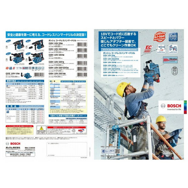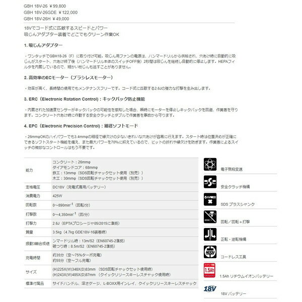 ボッシュ BOSCH 18Vでコード式に匹敵するスピードとパワー 別販売品の吸じんアダプター装着でどこでもクリーン作業OK コードレスハンマードリル GBH 18V-26H(本体のみ) ※バッテリ・充電器・ケースは別販売品です。1. 吸じんアダプター ・ワンタッチでGBH18-26(F)に取り付け可能。吸じん用ファンの電源は、ハンマードリルから供給され、穴あけ時に自動的に吸じんがスタート、穴あけ終了後(ハンマードリル本体のスイッチOFF後)2秒間は吸じんを継続し自動的に停止します。HEPAフィルタを内蔵しているので、細かい粉じんも逃すことがありません。 2. 高効率のECモーター(ブラシレスモーター) ・効率が高く、長時間の使用でもメンテナンスフリーです。コード式に匹敵する2.6Jの強力な打撃を生み出します。 3. ERC(Electronic Rotation Control):キックバック防止機能 ・内蔵された加速度センサーがキックバックの可能性を感知した場合、瞬時にモーターを停止しキックバックを回避、作業者を守ります。コンクリート穴あけ時に作動する安全クラッチとダブルで作業者を事故から守ります。 4. EPC(Electronic Precision Control):細径ソフトモード ・26mmφOKのハイパワーでも3.4mmφの細径で縁欠けの少ないきれいな穴あけが容易に行えます。スタート時は位置決めが正確にできるソフトスタート機能を備え、また最大パワーを70%に抑えているので、ビットの折れや縁欠けを防ぎます。作業者によるスイッチの微妙なコントロールはもう不要です。