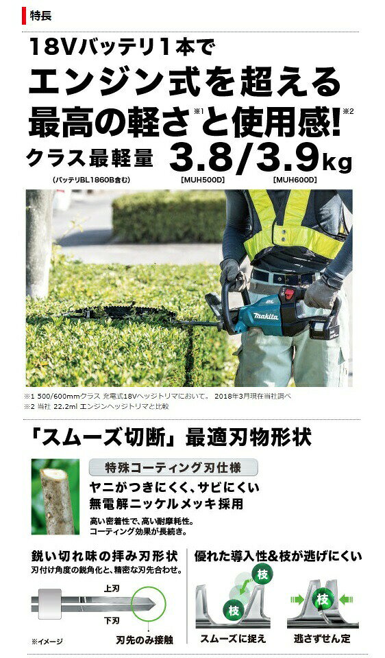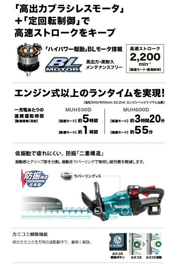 マキタ makita 充電式ヘッジトリマ MUH500DZ 本体のみです。 ※バッテリ・充電器は別販売です。 ■18Vバッテリ1本でエンジン式を超える最高の軽さと使用感! ※1 500/600mmクラス 充電式18Vヘッジトリマにおいて。 2018年3月現在当社調べ ※2 当社 22.2ml エンジンヘッジトリマと比較 88381859905マキタ makita 充電式ヘッジトリマ ※販売はタイトルの商品です。 ■18Vバッテリ1本でエンジン式を超える最高の軽さと使用感! ※1 500/600mmクラス 充電式18Vヘッジトリマにおいて。 2018年3月現在当社調べ ※2 当社 22.2ml エンジンヘッジトリマと比較 ■「スムーズ切断」最適刃物形状 特殊コーティング刃仕様 ヤニがつきにくく、サビにくい無電解ニッケルメッキ採用 高い密着性で、高い耐摩耗性。コーティング効果が長続き。 ・鋭い切れ味の拝み刃形状 刃付け角度の鋭角化と、精密な刃先合わせ。 ・優れた導入性&枝が逃げにくい ■「高出力ブラシレスモータ」+「定回転制御」で高速ストロールをキープ ■エンジン式以上のランタイムを実現! ■低振動で疲れにくい。防振「二重構造」 振動部とグリップ部を分割。振動をラバーリングで吸収し疲労感を軽減します。 ■カミコミ解除機能 枝のカミコミを刃物の逆転動作で、素早く解除。 ■ボタン変速(3段)+トリガ変速 仕上げ作業に合わせてストローク数を調整可能。 ■回転式ハンドル(5段階調整) 横向き刈り込みがしやすい左右45°・90° ■枝葉をキャッチ、大型チップレシーバ 枝葉が落ちにくい 枝葉が滑りにくい ■「アプト」防滴・防じん 本製品は水や粉じんに対する影響が抑えられる様に設計されていますが、水や粉じんによって故障しないことを保証するものではありません。