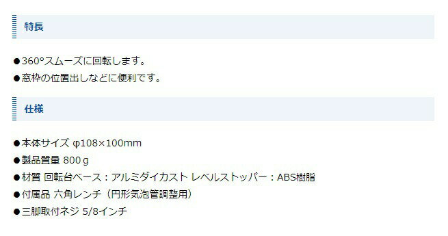 シンワ 製品コード 76478 製品名 回転台 レーザーレベル用 ■特長 ・360°スムーズに回転します。 ・窓枠の位置出しなどに便利です。 ■仕様 ●本体サイズ φ108×100mm ●製品質量 800g ●材質 回転台ベース:アルミダイカスト レベルストッパー:ABS樹脂 ●付属品 六角レンチ(円形気泡管調整用) ●三脚取付ネジ 5/8インチシンワ 製品コード 76478 製品名 回転台 レーザーレベル用 ■特長 ・360°スムーズに回転します。 ・窓枠の位置出しなどに便利です。 ■仕様 ●本体サイズ φ108×100mm ●製品質量 800g ●材質 回転台ベース:アルミダイカスト レベルストッパー:ABS樹脂 ●付属品 六角レンチ(円形気泡管調整用) ●三脚取付ネジ 5/8インチ