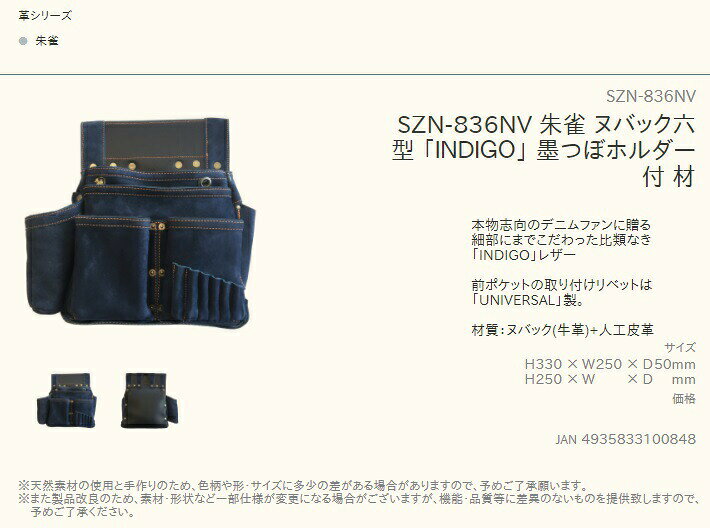 ふくろ倶楽部 革シリーズ 朱雀 ヌバック六型 「INDIGO」 墨つぼホルダー付 SZN-836NV 本物志向のデニムファンに贈る 細部にまでこだわった比類なき「INDIGO」レザー 前ポケットの取り付けリベットは「UNIVERSAL」製 ■仕様 材質:ヌバック(牛革)+人工皮革 サイズ:H330× W250× D50mm ※天然素材の使用と手作りのため、色柄や形・サイズに多少の差がある場合がありますので、予めご了承願います。 ※また製品改良のため、素材・形状など一部仕様が変更になる場合がございますが、機能・品質等に差異のないものを提供致しますので、予めご了承ください。ふくろ倶楽部 革シリーズ 朱雀 ヌバック六型 「INDIGO」 墨つぼホルダー付 SZN-836NV 本物志向のデニムファンに贈る 細部にまでこだわった比類なき「INDIGO」レザー 前ポケットの取り付けリベットは「UNIVERSAL」製 ■仕様 材質:ヌバック(牛革)+人工皮革 サイズ:H330× W250× D50mm