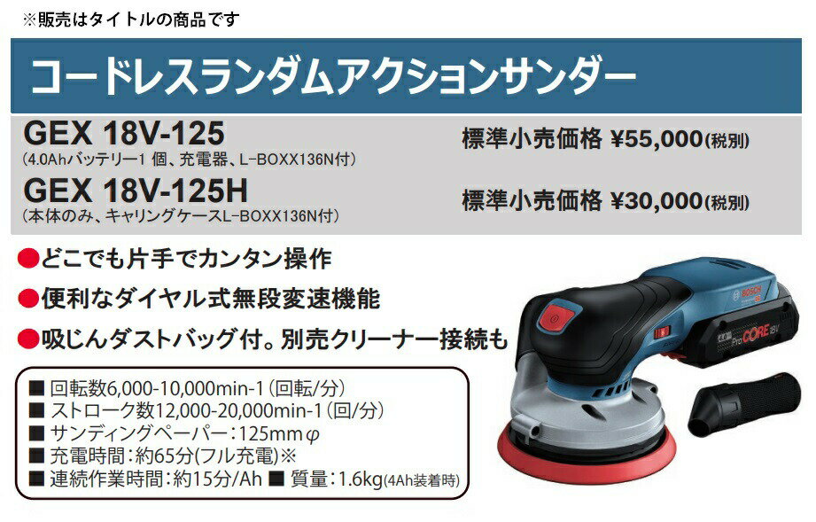 ボッシュ BOSCH 18Vコードレスランダムアクションサンダー GEX18V-125H 本体のみ、L-BOXX136N付です。 ■特長 ・どこでも片手でカンタン操作 ・便利なダイヤル式無段変速機能 ・吸じんダストバッグ付。別売クリーナー接続も ■仕様 ・ 回転数6,000-10,000min-1(回転/分) ・ ストローク数12,000-20,000min-1(回/分) ・ サンディングペーパー:125mmφ ・ 充電時間:約65分(フル充電) ※4.0Ahバッテリー装着時 ・ 連続作業時間:約15分/Ah ・ 質量:1.6kg ※4.0Ahバッテリー装着時ボッシュ BOSCH 18Vコードレスランダムアクションサンダー GEX18V-125/GEX18V-125H ※販売はタイトルの商品です。