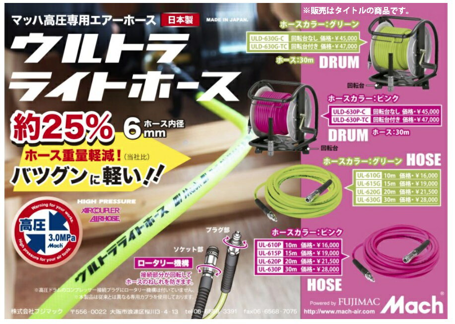フジマック ウルトラライトホースドラム ULD-630P-C ピンク 回転台なし 長さ30m 内径6mm マッハ高圧専用エアーホース FUJIMAC 在庫