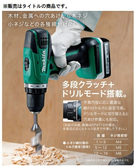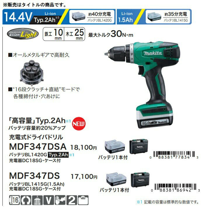 マキタ makita 充電式ドライバドリル MDF347DSA バッテリBL1420G+充電器DC18SG+ケース付 ●プロ機同等の高耐久! Li-ionバッテリ採用のDIYエントリーモデル ●1台で、穴あけからネジ締めまで。2モード切換え・16段クラッチ+直結 ●無段変速スイッチ付2スピード切替 ●直流14.4V、スライド式Li-ionライトバッテリ仕様、2.0Ahバッテリ・充電器・ケース付 ●チャック方式:キーレスチャック/チャック能力:0.8〜10mm ●最大トルク:30N・m、回転数:高速0〜1,400/低速0〜400[回転/分] ●穴あけ能力:鉄工10mm、木工25mm、ネジ締め能力:木ネジφ5.1x63、小ネジM6 ●1充電あたりの作業量(目安):約480コ[木工穴あけφ9×30mmラワン](BL1420G使用時) ●本機寸法:198x83x235mm(長さ×幅×高さ) ●質量:1.4kg(バッテリ含む) 88381778343マキタ makita 充電式ドライバドリル MDF347DSA/MDF347DS ※販売はタイトルの商品です。