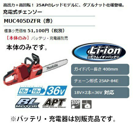 セット品をバラした商品です。商品内容は同じです。 マキタ makita 充電式チェンソー MUC405DZFR カラー:赤 本体のみです。 ※販売はタイトルの商品です。 88381870450マキタ makita 充電式チェンソー MUC405DZFR 本体のみです。 ※販売はタイトルの商品です。 ■高出力+高回転 レッドボディ&25AP仕様登場。 ■プロの作業に「25AP仕様」 羽数が多いため、軽く滑らかな切れ味。 耐久性に優れ、プロやセミプロユーザーのハードな作業にも最適。 ■ナット脱落防止 ■ワンタッチで電源ON サッと使える。 ■変速トリガスイッチ ■金属製スパイクバンパ ■チェーンオイル残量確認窓 ■「アプト」防滴・防じん 本製品は水や粉じんに対する影響が抑えられる様に 設計されていますが、 水や粉じんによって 故障しないことを保証するものではありません。 ■その他特長 ・定回転制御を搭載。負荷が掛かってもチェーンスピードが落ちにくい。 ・主電源スイッチ・オートオフ ・バッテリ残容量表示(LED3灯×2) ・キックバックブレーキ ・「25AP」刃数が多く、軽く滑らかな切れ味