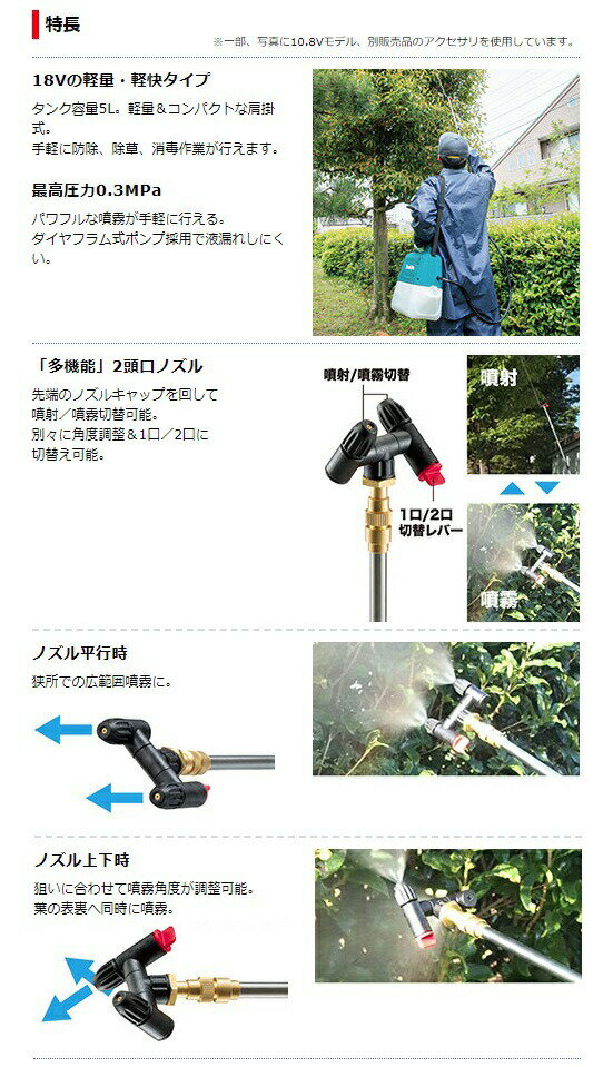 マキタ makita 充電式噴霧器 MUS054DWF バッテリBL1830B、充電器DC18WC付 88381784580 ■18Vの軽量・軽快タイプ タンク容量5L。軽量&コンパクトな肩掛式。 手軽に防除、除草、消毒作業が行えます。 ■最高圧力0.3MPa パワフルな噴霧が手軽に行える。 ダイヤフラム式ポンプ採用で液漏れしにくい。 ■「多機能」2頭口ノズル 先端のノズルキャップを回して噴射/噴霧切替可能。 別々に角度調整&1口/2口に切替え可能。 ■ノズル平行時 狭所での広範囲噴霧に。 ■ノズル上下時 狙いに合わせて噴霧角度が調整可能。 葉の表裏へ同時に噴霧。 ■「手元でオン/オフ」パドルスイッチ 素早くON/OFFできハウス内の散布に便利。 ロックオンスイッチ付で連続噴霧も可能。 ■ホース長1.7m ■噴霧管を3ヶ所に収納可能 縦置きは表裏に収納でき、上向き、下向きに対応。横置きにも対応。 ■伸縮式噴霧管(伸縮幅20cm) ■曲面形状 肩掛け時に体にフィット。 ■ワンタッチバッテリ脱着 ■防じん・防水保護等級IP54 ※水や粉じんによって故障しないことを保証するものではありません。 ■バッテリ残容量表示(3段階) ■軽量カップ付属マキタ makita 充電式噴霧器 MUS053D/MUS054D ※販売はタイトルの商品です。