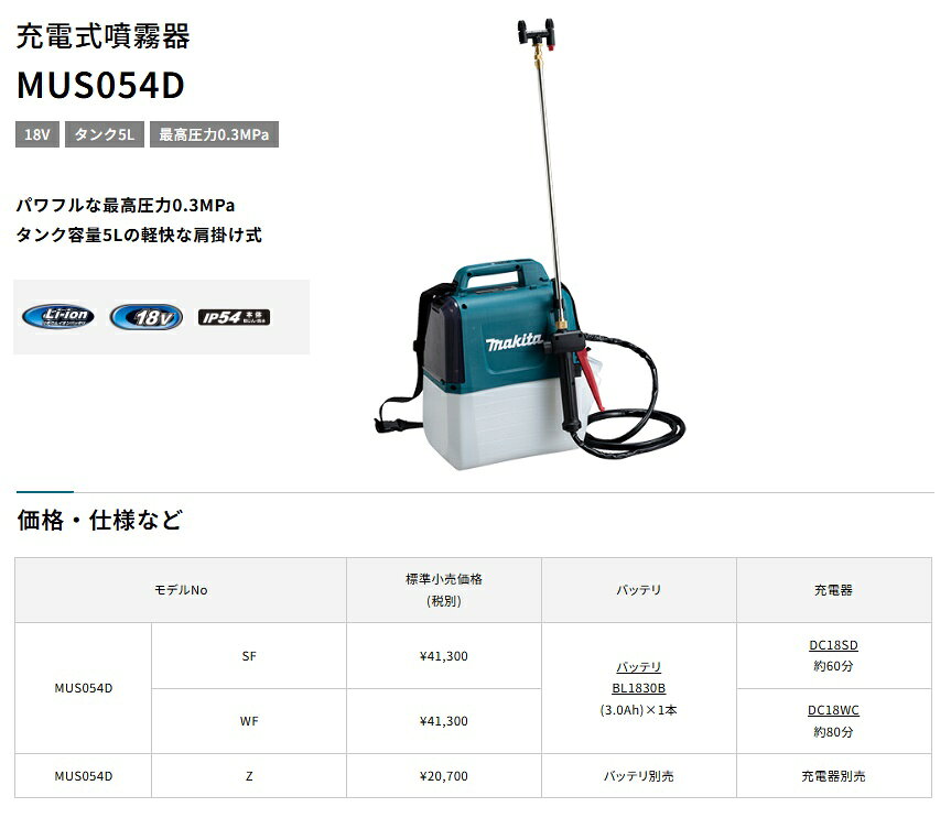 マキタ 充電式噴霧器 MUS054DWF バッテリBL1830B+充電器DC18WC付 タンク容量5L 最高圧力0.3MPa 18V対応 makita 在庫