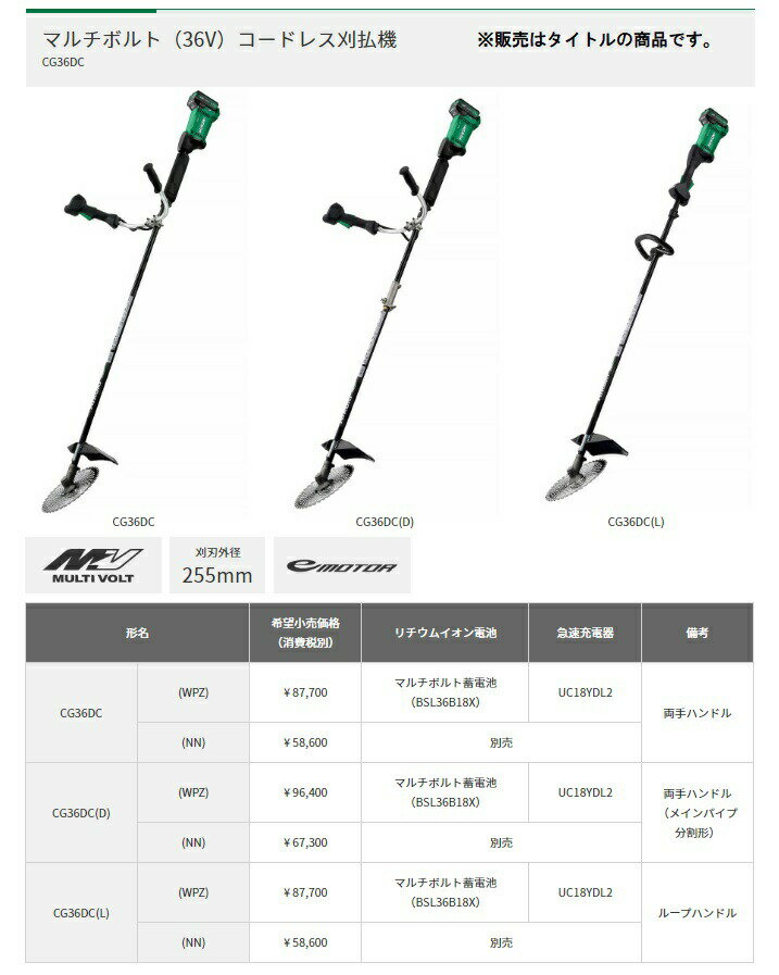 ☆ HiKOKI コードレス刈払機 CG36DC(D)(WPZ) 両手ハンドル 分割タイプ 36V対応 ハイコーキ 日立 大型商品 在庫