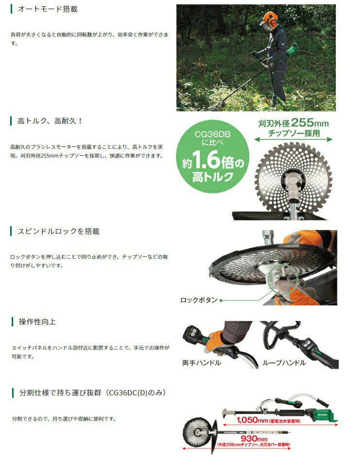 HiKOKI ハイコーキ(旧日立工機) マルチボルト(36V)コードレス刈払機 CG36DC(D)(WPZ) マルチボルト(BSL36B18X)+急速充電器(UC18YDL2)付です。 ■オートモード搭載 負荷が大きくなると自動的に回転数が上がり、効率良く作業ができます。 ■高トルク、高耐久! 高耐久のブラシレスモーターを搭載することにより、高トルクを実現。刈刃外径255mmチップソーを採用し、快適に作業ができます。 ■スピンドルロックを搭載 ロックボタンを押し込むことで回り止めができ、チップソーなどの取り付けがしやすいです。 ■操作性向上 スイッチパネルをハンドル部付近に配置することで、手元での操作が可能です。 ■分割仕様で持ち運び抜群(CG36DC(D)のみ) 分割できるので、持ち運びや収納に便利です。HiKOKI ハイコーキ(旧日立工機) マルチボルト(36V)コードレス刈払機 CG36DC/CG36DC(D)/CG36DC(L) ※販売はタイトルの商品です。