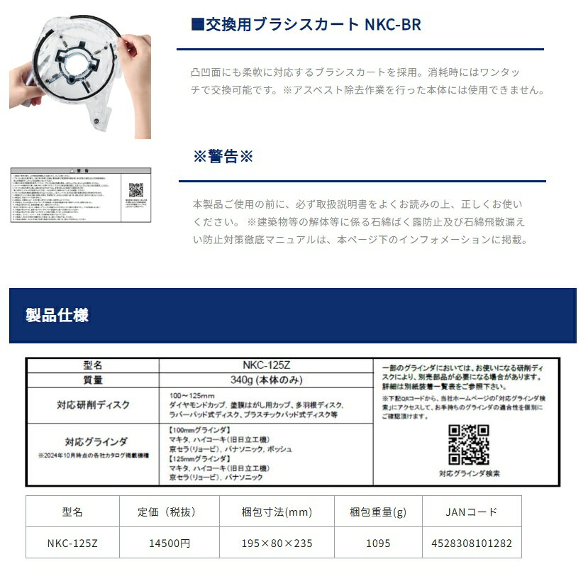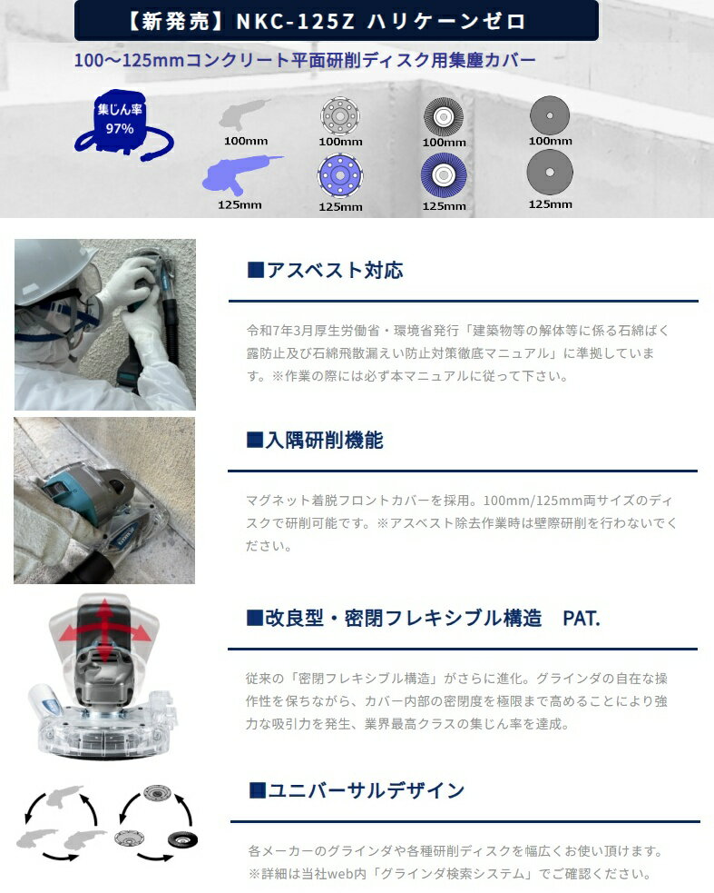 ナカヤ NAKAYA 100mm〜125mm コンクリート平面研削ディスク用集塵カバー ハリケーンゼロ NKC-125Z ■アスベスト対応 令和7年3月厚生労働省・環境省発行「建築物等の解体等に係る石綿ばく露防止及び石綿飛散漏えい防止対策徹底マニュアル」に準拠しています。※作業の際には必ず本マニュアルに従って下さい。 ■入隅研削機能 マグネット着脱フロントカバーを採用。100mm/125mm両サイズのディスクで研削可能です。※アスベスト除去作業時は壁際研削を行わないでください。 ■改良型・密閉フレキシブル構造 PAT. 従来の「密閉フレキシブル構造」がさらに進化。グラインダの自在な操作性を保ちながら、カバー内部の密閉度を極限まで高めることにより強力な吸引力を発生、業界最高クラスの集じん率を達成。 ■ユニバーサルデザイン ■交換用ブラシスカート NKC-BR 凸凹面にも柔軟に対応するブラシスカートを採用。消耗時にはワンタッチで交換可能です。※アスベスト除去作業を行った本体には使用できません。 ※警告※ 本製品ご使用の前に、必ず取扱説明書をよくお読みの上、正しくお使いください。ナカヤ NAKAYA 100mm〜125mm コンクリート平面研削ディスク用集塵カバー ハリケーンゼロ NKC-125Z