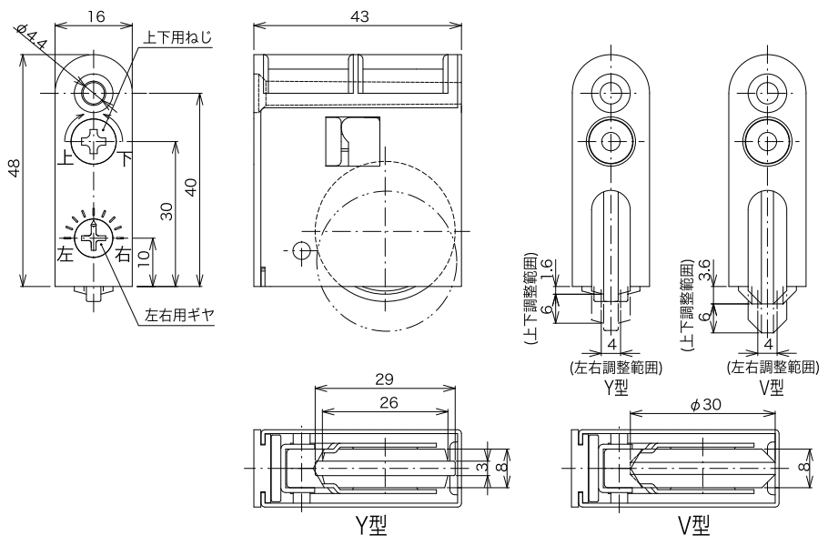 ※バラ1個からの販売となります ■木製引き戸の戸車の取り替えに最適な調整戸車です ■軸受にベアリングを使用しており、 耐久性はメーカーテストで27万回の安心設計です ■上下・左右の調整が可能です ■積水ハウスなどハウスメーカー各社の引き戸に適合した商品です ● 上下・左右の調整機能付き ● ネジゆるみ止め付き ※「SR2-Ym4-3」もしくは「KHSR2-Y4」の型番の商品をご利用の場合でも「Y型(SR2-Y4・コマの色:黒)」で問題なく取り替えをしていただけます 本体材質 SGCC・ABS樹脂 コマ材質 ポリアセタール樹脂 コマ径 φ30 コマ種類 V型(コマ:白色)/Y型(コマ:黒色) 軸受け ベアリング626ZZ 耐久性 27万回 (メーカーテスト値) 耐荷重 40Kg (2個) 家研販売株式会社の商品です 調整戸車 SR2(Y4・V4)型 ■戸車寸法 ■戸の調整方法 建て付けの調整その後のメンテナンスが容易です 戸の位置の上がり下がりの調整は 小口面からドライバーでネジを回しながら調整してください ■掘り込み寸法 ■適合メーカー 【ハウスメーカー】 積水ハウス/住友林業/旭化成ホームズ 三井ホーム/トヨタホーム/セキスイハイム クボタハウス/一条工務店 【建材メーカー】 大建工業/ウッドワン 【その他一般工務店】
