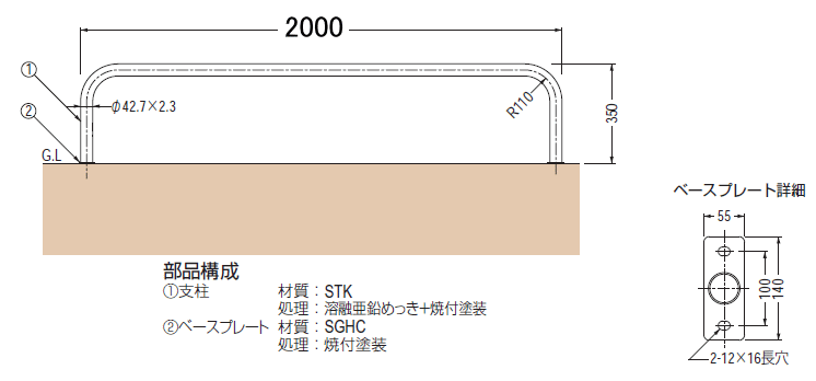 自転車やバイクの盗難防止にお役立てください ■後付けタイプ(ベースプレート型)です ■スチール製のホワイト塗装仕上げです ■目安としまして、3~4台の駐輪が可能です ※取り付け用のアンカー、ボルト類はお客様でご用意ください 固定にはM10の「あと施工アンカー」をご使用ください ベースプレートの固定には、「めねじタイプのあと施工アンカー」および「六角穴付きボタンボルト」を使用するときれいに納まります サイズ:幅(W)2000 mm× 地上高(H)350 mm 使用パイプ:Φ42.7×2.3t 質量:6.5kg 駐輪台数(目安):3~4台 部品構成: 【支柱】材質:STK 処理:溶融亜鉛メッキ+焼付塗装 【アンカー】材質:SS400 処理:電気亜鉛メッキ