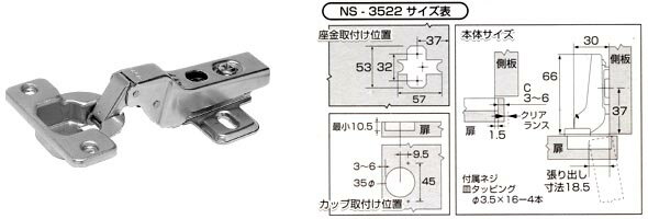 ■取付ビスは別売りです■ 開き角度 仕様 入数 93度開き キャッチなし 1 取付図/軌跡図/扉加工はこちら