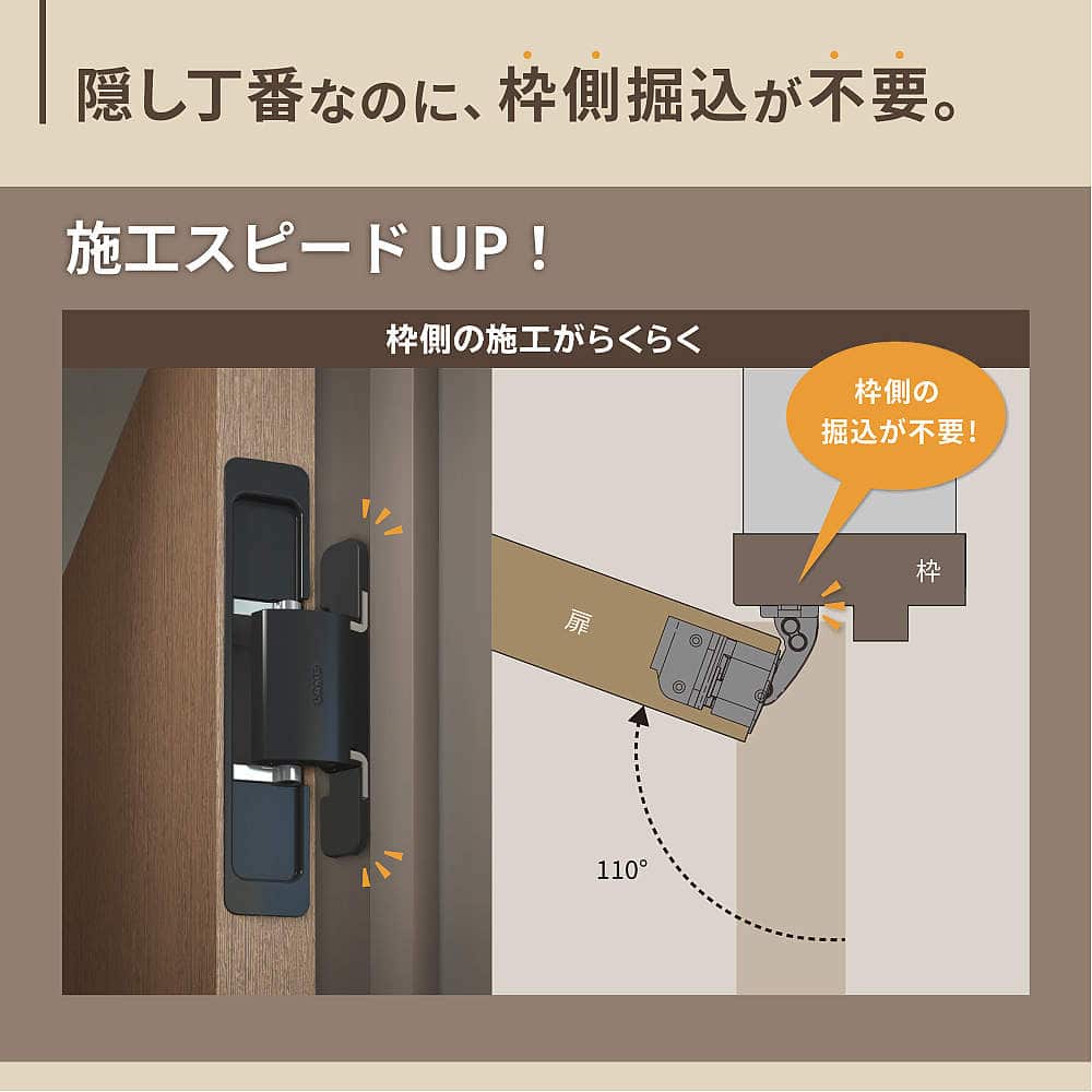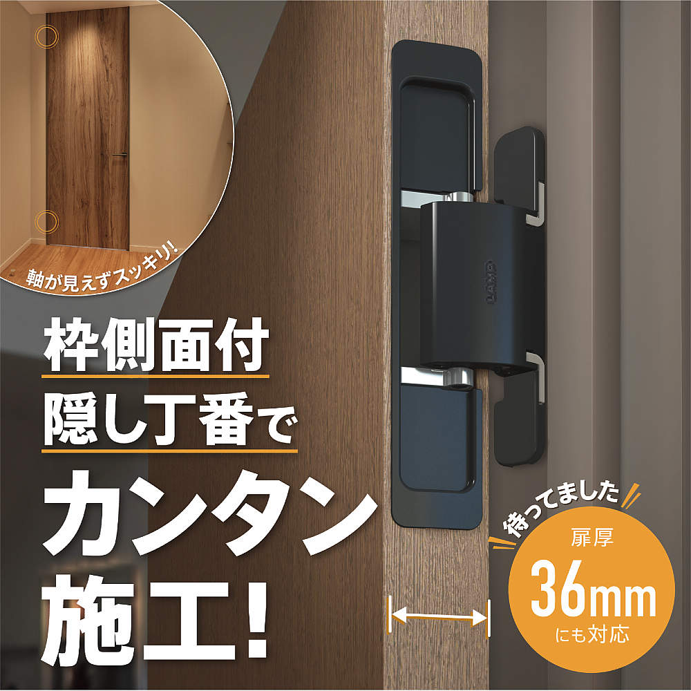 枠側を掘り込まずに面付できる隠し丁番です。現場の作業を大幅に短縮できます。 35mm以上の扉厚に対応しています。 35・36mmの扉にセンター取付できます。(扉の左右勝手なし) 扉の吊り込み後でも、三次元調整(上下、左右、前後)可能です。 扉幅 900mm以下 扉高さ 2700mm以下 扉厚 35mm以上 耐荷重 40kgf/2ヶ、50kgf/3ヶ 開き角度 110° 付属品 十字穴付皿タッピンねじ4×20(4本/丁番1ヶ)ステンレス 十字穴付トラスタッピンねじ4×16(4本/丁番1ヶ)鋼 六角棒スパナ呼び3 扉側掘込・枠側取付テンプレート