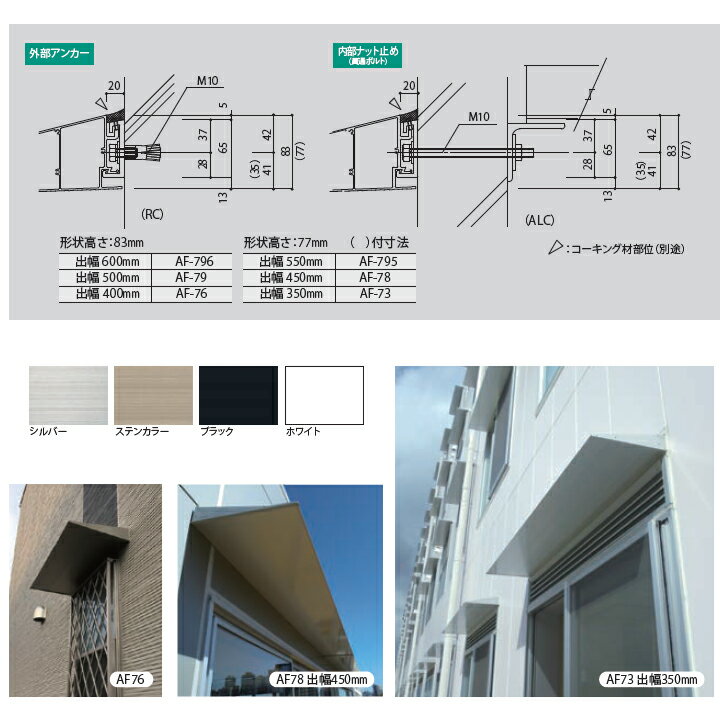 アルフィン 庇 後付け アルミ庇アルフィン アルミ庇 AF79 出幅500mm ひさし全長 801mmから1100mmまで スリム、シャープ、シンプルを極めた新定番庇 アルフィン アルミ庇 AF79 出幅500mm ひさし全長 801mmから1100mmまで・出幅500mm・全長 801mmから1100mmまで ※1mm単位で指定可能この商品は取付部材が付属します。内部ナット止式または金属拡張アンカーどちらかをお選びください。※RC以外の躯体は貫通止めを条件とします。購入手続き時に壁厚をご記入ください。この商品はメーカー様より直送となりますので代引きでのお取扱いはできません。寸法確認後の受注生産品です。納期目安は約2週間となります。オプションでLED照明の取付も可能です。※有償個人宅へは配送不可です。お届け先は法人名または受取人様を含む現場名を必ず明記してください。ご注文内容確認のため個別にご連絡させていただく場合がございます。このためお電話番号の登録は携帯電話番号などの必ず繋がるお電話番号を登録してください。北海道・沖縄・離島へは別途送料が必要になります。 2