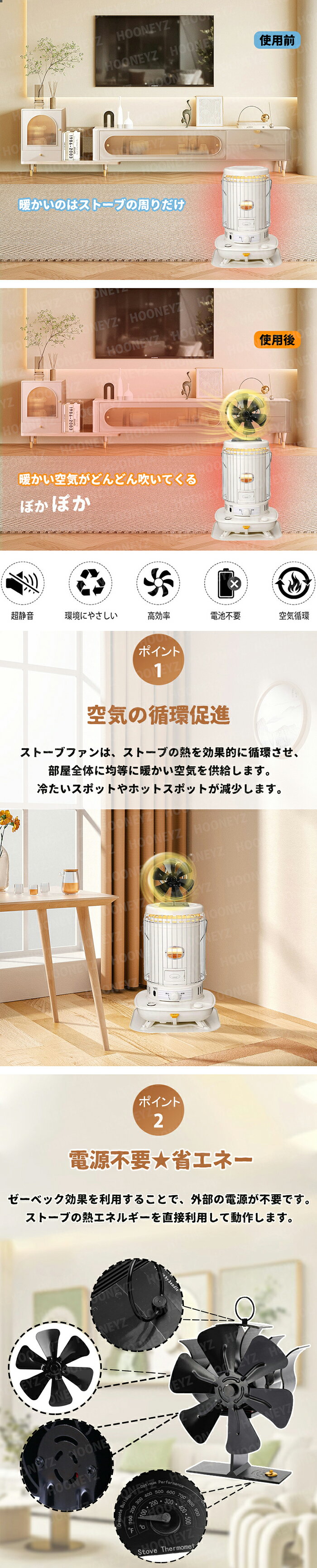 ★★2022最新版★★ 【商品詳細】 information ■商品名:ストーブファン ■セット内容:ストーブファン、ストーブ温度計、日本語説明書 ■商品重量:約750g ■材質:アルミ合金 ■稼働開始温度:70℃ ■暖炉、薪ストーブの最大許容温度:345℃ ■羽タイプ:6本の羽 ■生産国:中国 取扱注意事項: 1.ストーブの作業効率を監視および最適化し、 過熱(345°Cを超えてはいけない)によるストーブファンの損傷を防ぎます。 2.使用時間:2-3時間を連続ご使用の場合、一度冷めてからご使用ください 。 3.冷める時間:羽根の回転が止まるまで約30分間必要! 4.薪ストープの温度管理は非常に重要です。 5.使用中は本体が熱くなりますのて、素手で触らないてください。移動など 触れる際は軍手などを着用ください。 6.怪我のおそれがありますのでお子様やペットが触れないようご注意ください。 【長期安心保証】 当店からご購入場合、【安心の6か月保証】が付き、品質向上と不良率を低下させるには常に努めておりますが、商品不良率をゼロにすることができかねます。万が一商品不具合のようでしたら、販売店にメールにてお気軽にご連絡ください。 必ず最善を尽くし、保証サービスをご対応いたします。お客様にご満足頂けるよう精一杯努力いたします! ★★★ご注意★★★ ※本製品を使用して発生しうる、事故、損害、損傷、破損等、さらに二次的事故損害についても 弊社では一切の責任を負いかねます。 ※新品ですが、輸入品のため稀に汚れや傷等がある場合がございますが、ご了承下さい。 ※外観及び仕様は予告なく変更になる場合もございます。 ※モニターの発色により実際のものと色が異なる場合があります。 ※初期不良の場合、新品を交換することまたは返品が可能でございますので、お気軽にお問い合わせくださいませ。 納期 即納商品の納期 ご入金(決済)後、翌営業日に出荷予定 予約商品の納期 カラー×サイズの後ろに記載しておりますので、ご参照お願い致します ★使用時間★ 2-3時間を連続ご使用の場合、一度冷めてからご使用ください。 ★冷める時間★ 羽根の回転が止まるまで約30分間必要! ★ストーブファンが高いところから落ちないように気をつけてください。★ 羽根が変形すると、正常に動作しません。 ※本製品は防水機能はございません。汚れた場合は必ず火を落として冷ましてから、乾いた布等で拭いてください。 ※ファンの速度は温度によって変わります。 ※稼働最適温度:70℃~345℃。ストーブ上部が高熱にならないタイプのストーブ・ファンヒーターなどではご利用いただけません。 ※※使用中は本体が熱くなりますので、素手で触らないでください。移動など触れる際は軍手などを着用ください。 ※怪我のおそれがありますので、お子様やペットが触れないよう注意してご使用ください。 ・300℃以上の熱源上でご利用の場合は本体の変色等ある場合があります。予めご了承くださいませ。 ・本品は輸入商品となりますので外箱に擦り傷や凹みがある場合があります。 ・外箱の擦り傷や凹みでの返品は致しかねますので、予めご了承くださいませ。 【おすすめポイント】 部屋全体がポカポカ 暖炉ツインストーブファン が、おかげ様をもちまして好評をいただいております。 ストーブファンは、大風量のファンブレードを備えているため、温風の循環を改善し、暖かい空気が部屋全体を素早く暖めます。 冬のキャンプ場では、電源が足りないのでストーブの扇風機には電源が不要です。 また、寒い冬の中「その周りはとっても暖かい薪ストーブですが、少し離れると・・・寒い。」 「室内の上は暖かいけど、足元が冷える・・・」 ということを悩んだらツインストーブファン1本で解決! オフィス、リビングルーム、家庭用、など様々なシーンでご活用いただけます。 暖かい/ヒーター/ストーブ/石油ストーブ/キャンプ/防寒 ストーブファン 6枚 キャンプ ストーブ ストーブ 灯油石油ストーブ ストーブファン 暖かい ストーブファン アウトドア ストーブファン 小型 ストーブファン 持ち運び ストーブファン 温度計 ストーブファン 石油ストーブ ストーブファン 静音 ストーブファン 薪ストーブ ストーブファン 耐久性 ストーブファン 耐熱温度 ストーブファン 風量 ストーブファン 比較 ストーブファン 必要 ストーブファン 安全 ストーブファンの魅力 部屋全体がすぐに暖まる 電源不要!置くだけで使える 電気代、燃料の節約になる 温度計付きのおすすめストーブファン※新品おすすめ