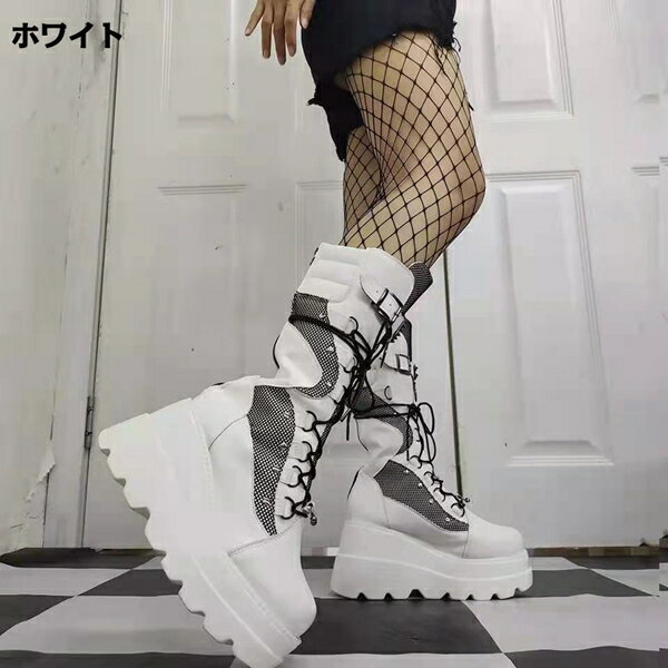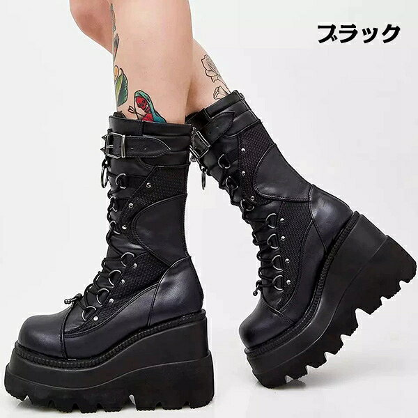 【レビュー特典】ショートブーツ レディース 厚底ブーツ 厚底ブーツ ミドル丈 PU 無地 太ヒール パンク風 ローヒール チャンキーヒール ブラック 黒 大きいサイズ 美脚 厚底 靴 ゴシック/原宿系/原宿ファッション