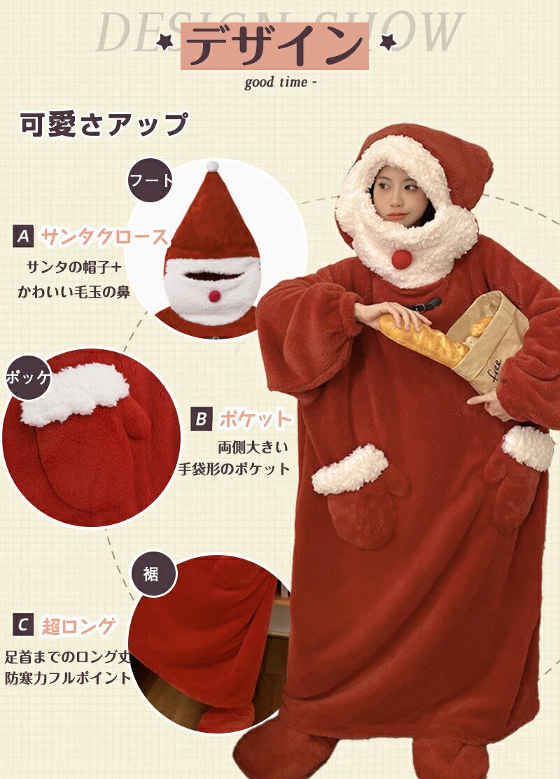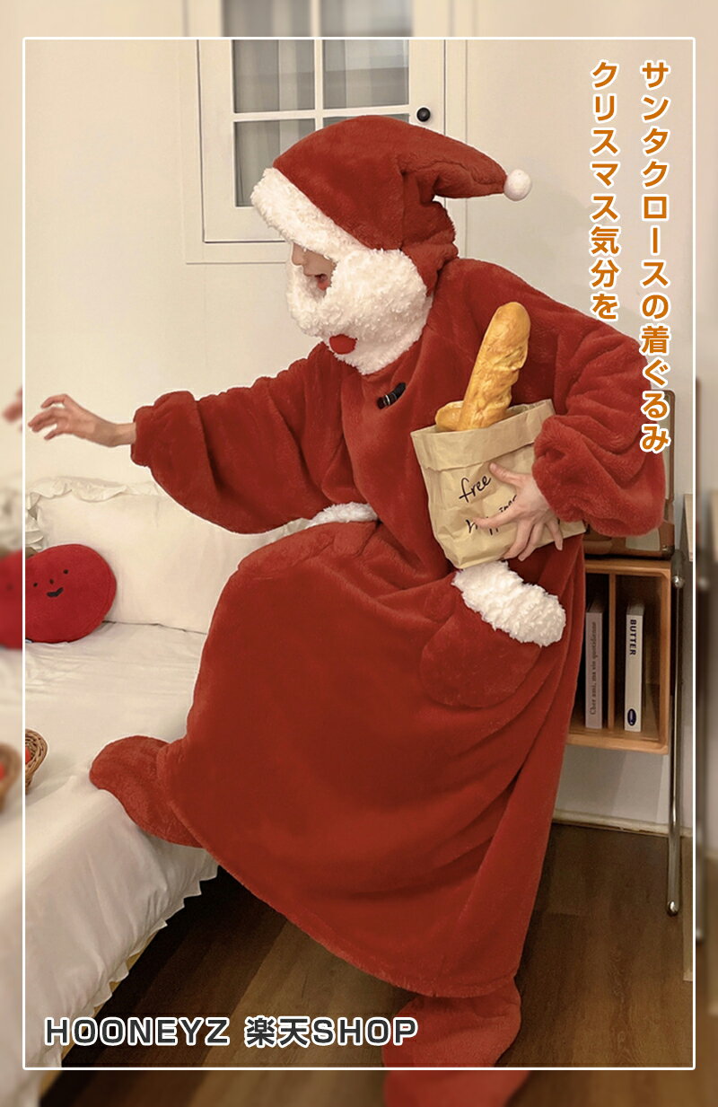 サンタクロース 着ぐるみ レディース もこもこ ルームウェア 冬 パジャマ 2点セット フランネル ふわふわ ボア 大人用 着る毛布+ルームシューズ サンタ帽子 プルオーバー ガウン ロング丈 ワンピース ゆったり 柔らかい 暖かい 防寒 秋冬 部屋着 寝巻き コスプレ 可愛い