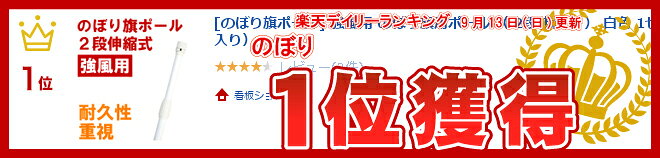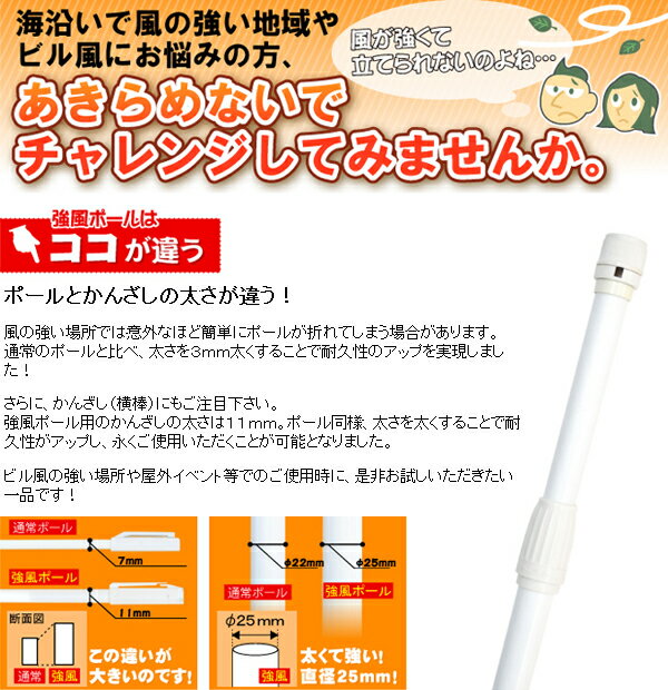 【仕様表】 ■サイズ: ・全長:1.6m〜3m(2段伸縮式) ・パイプ直径: 上部22mm + 下部25mm(下部キャップ:直径25mm) ・横棒: 長さ85cm(断面:5mm×11mm) ■素材: ・回転頭…ABS樹脂製 ・横棒(かんざし)…FRP樹脂製+PVCコーティング ・パイプ…スチール製、樹脂コーティング ・ジョイント…ABS樹脂製 ・下部キャップ…ABS樹脂製 ■カラー:白色 ■備考: 横棒はポールの中に入っています。 合わせてご使用されるポールとの適合につきましては回転頭の内径サイズを確認ください。 ★当店取扱いポール・立て台・取付用品の適合サイズ表はこちら>> のぼり旗用ポールの一覧はこちら>> のぼりポール用の立て台・固定部品の一覧はこちら>> のぼり旗の一覧はこちら>>ポールとかんざしの太さが違う! 風の強い場所では意外なほど簡単にポールが折れてしまう場合があります。 通常のポールと比べ、太さを3mm太くすることで耐久性のアップを実現しました! さらに、かんざし(横棒)にもご注目下さい。 強風ポール用のかんざしの太さは11mm。ポール同様、太さを太くすることで耐久性がアップし、永くご使用いただくことが可能となりました。 ビル風の強い場所や屋外イベント等でのご使用時に、是非お試しいただきたい一品です! 強風用ポールは、通常のポールよりパイプ径が3mmも太く、曲がりにくく、折れにくい設計となっています。 スチールパイプを樹脂コーティングした環境に優しいエコ・ポールです。 のぼり旗の業界的には最も定番の仕様で、縮小時約1.6m〜伸長時3mのサイズになります。 ポールのカラーは、どんなデザインの のぼりにもマッチする白色をご用意いたしました。 ジョイント部分はねじ式で、締めることによってポールがお好みの長さで固定できます。調節してご利用ください。 のぼりがなびくと、回転頭がくるくる回転するので風圧による破損を防ぎます。回転頭には5mm厚のかんざし(横棒)がご使用いただけます。 ジョイント部はネジ式の締め付け固定です。緩めて全体の長さを調整できます。お好みの長さでご使用ください。 下部キャップは外径φ25mmです。適合するポール立て台をご使用下さい。 かんざし(横棒)はパイプの中に収納されています。回転頭をはずして取り出して下さい。 かんざし(横棒)は樹脂コーティングされています。先端部分までコーティングされているので、ささくれ等を通さず怪我をしにくくなりました。 横棒先端部 回転頭の頭部分はネジ式です。かんざし(横棒)を取り付ける際は、頭部分を緩めてからかんざしを差し込み、締めて固定して下さい。 回転式先端キャップ かんざし(横棒)の先端部。のぼりの“チチ”を引っ掛けて使用します。横棒の長さは85cmで幅70cmまでののぼりがご使用頂けます。 ●こんな場所・こんな用途におすすめです● ホワイト / 白 / 竿 / 棒 / 折れにくい / 傷みにくい / 曲がりにくい / 丈夫 / 頑丈 / 太い / 強い / 耐久性 / 耐久力 / 長持ち / 風 / 強風 / ビル風 / 海沿い / 転倒 / 防止