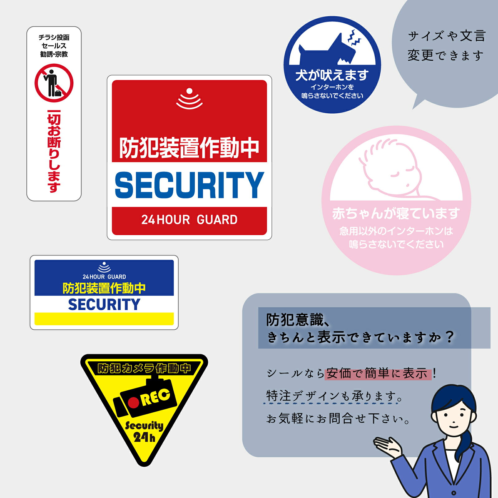 防犯対策、きちんと表示できていますか? 当商品を使えば安価で簡単に解決できます! 何が起こるかわからない不安もこれで安心♪ 【仕様表】 ■サイズ:210mm×297mm(A4サイズ) ■素材:塩ビ製粘着シート(再剥離) ■印刷:インクジェット出力シート貼り、屋外対応(色褪せしにくいUVカット加工済) ■数量:1枚、3枚セット、5枚セットからお選びいただけます。 ■備考: 外貼り仕様です。ご使用のモニターやスマートフォンの明るさ設定等により、色の見え方が製品と異なる場合がございます。予めご了承ください。 サイズ変更や文言変更も対応可能です。お気軽にお申し付けください。防犯/玄関ドア/対策/窓