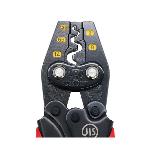 適用端子:裸圧着端子・スリーブ用 全長:243mm 質量:405g 端子・スリーブ呼び:1.25/2/5.5/8/14 【圧着工具使用上の注意】 ● 活線の圧着作業は行わないで下さい。感電の恐れがあります。 ● 圧着する端子およびスリーブに適合する工具を使用して下さい。 ● 適正な接続を得るため、圧着する端子およびスリーブと電線のサイズを間違えないようにして下さい。 圧着不良により火災の原因になる恐れがあります。 ● 成形確認機構により、完全に圧着できるまでハンドルは開かない構造になっております。 ハンドルが開くまで荷重を加えて下さい。 ● ご使用前に各部の損傷がないかをチェックし、損傷がある場合は修理に出して下さい。 圧着不良により火災の原因になる恐れがあります。 ● 工具の可動部(連結板・軸等)には、月に1?2回注油して下さい。 またご使用後はグリップを除く部分を油布で拭き保管して下さい。 ● 工具をハンマーやペンチ等のかわりとして、圧着作業以外に使用しないで下さい。 また工具を改造して使用しないで下さい。 ● 工具を安全にご使用いただく為、当社まで定期点検(有償)に出して下さい。(年1?2回)