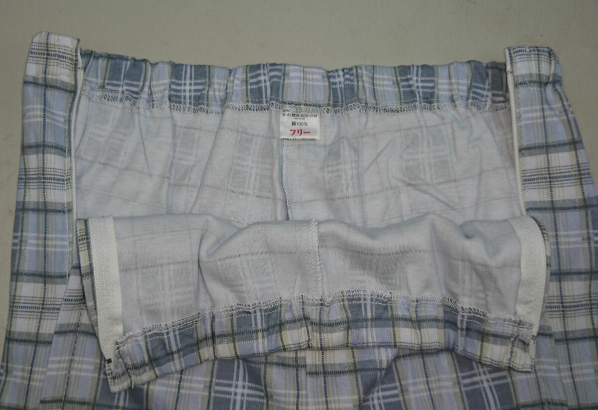 日本製国産洗い替えパジャマのズボン何枚も洗い替えが必要ですが上着はいらない のでパンツだけの予備が欲しいとご要望の方が 多くいらっしゃいます。 素材綿100%スムース 通常のパジャマのズボンですがウエスト前部分が 写真のように両前ファスナーで開きます。 ファスナーの長約45cm。大きく開きますので 介護で寝たきりの方やオムツの履き替えなど とても楽だと介護の方からの声が多い商品です。 また、両股にかけてマチをつけていますので オムツ着用の時など十分に容量を確保いたしました。 マチ部分約10cm。 介護で大変な洗い替えが必要なパジャマのズボン。 柄はお任せになりますので選択は出来ません。 裾は絞っていません。 綿素材は洗濯機でジャブジャブ洗えるイメージがありますが、 実は洗濯で縮みやすい素材です。 水をよく吸収する性質を持っていますが、 濡れると繊維が膨らんで、 繊維同士の間隔が狭まります。 乾燥機などのご使用にはご注意下さい。 単位cm 適応身長 ウエスト 股下 紳士 約164-174cm 約74-82cm 約70cm 婦人 約148-160cm 約62-72cm 約60cm ※厚みがあるためネコポス便でお送りできません 前が縦に両ファスナーがあり約45cm 開きます。 オムツの履き替えも作業が楽になります。 介護の現場でも大変喜ばれています。 特に洗濯の回数の多いズボンだけの販売です。 紳士介護ズボン単品はこちら→ 紳士介護ズボン3着まとめ買いはこちら→ 婦人介護ズボン単品はこちら→ 婦人介護ズボン3着まとめ買いはこちら→ 通常のパジャマのズボンのみ 紳士ズボン単品はこちら→ 紳士ズボン3本まとめ買いはこちら→ 婦人ズボン単品はこちら→ 婦人ズボン3本まとめ買いはこちら→