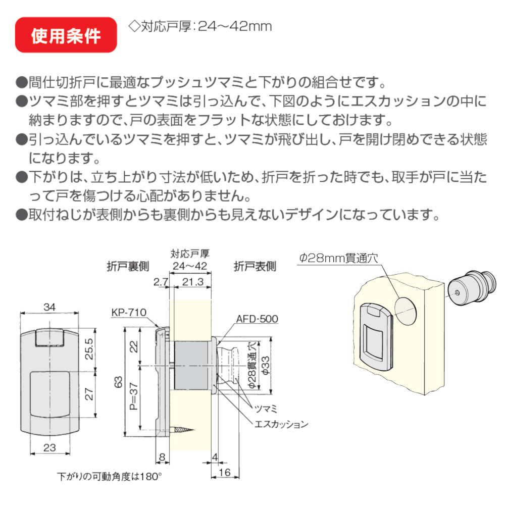 品番2080358商品名折戸用取手材質亜鉛合金、ABS(チョコ色)仕上げWBメッキ添付品+皿小ねじM3×20 1本(戸厚24〜32mm用)+皿小ねじM3×30 1本(戸厚32〜42mm用)+皿木ねじ3.1×16 1本使用条件◇対応戸厚:24〜42mm概要●間仕切折戸に最適なプッシュツマミと下がりの組合せです。●ツマミ部を押すとツマミは引っ込んで、下図のようにエスカッションの中に納まりますので、戸の表面をフラットな状態にしておけます。●引っ込んでいるツマミを押すと、ツマミが飛び出し、戸を開け閉めできる状態になります。●下がりは、立ち上がり寸法が低いため、折戸を折った時でも、取手が戸に当たって戸を傷つける心配がありません。●取付ねじが表側からも裏側からも見えないデザインになっています。