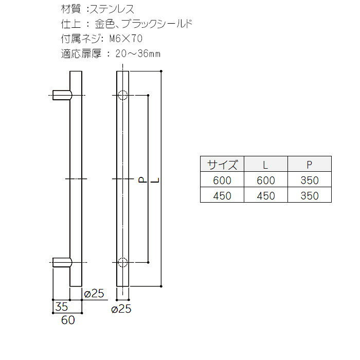 品番MDS-160サイズ(mm)600材質ステンレス仕上ブラックシールド付属ネジM6×70mm適応扉厚20〜36mm