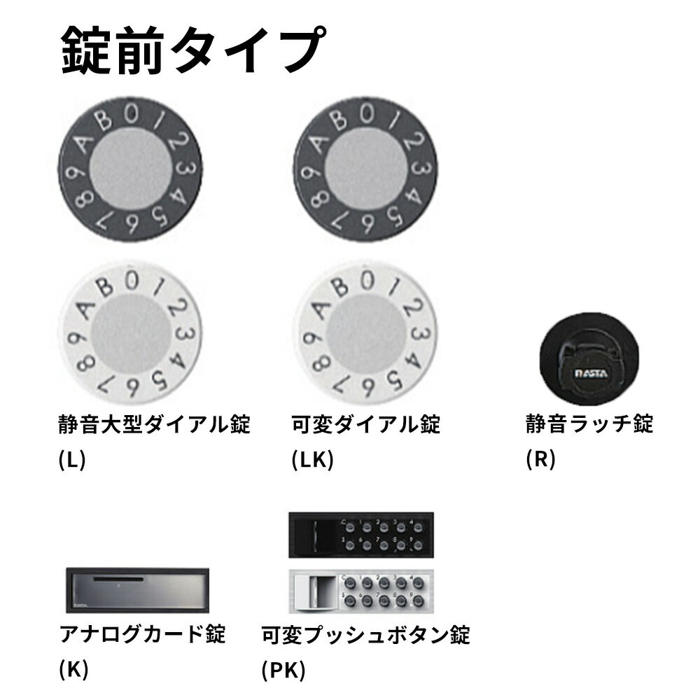 特長 ・盗難配慮機構「ナスタガード」付。(意匠登録済) ・扉開閉時の衝撃音を低減するトルクヒンジ付。(横開き) ・扉の急落を防ぐトルクヒンジ付。(上開き)品番KS-MB6002PYサイズ戸数2:280×240×406.2戸数3:280×360×406.2錠前錠前(下記よりお選びください)L:静音大型ダイヤル錠LK:可変ダイヤル錠PK:可変プッシュボタン錠R:静音ラッチ錠K:アナログカード錠色-S:ステンレスヘアーライン仕上:扉・投入口ヘアーライン仕上アクリル焼付塗装色:クリアアクリル焼付塗装カラーバリエーション設定粉体塗装(シルバー)材質本体:PC/ABS樹脂難燃グレード扉:ステンレス(SUS304)PC樹脂投入口:ステンレス(SUS304)質量戸数2:3.4kg戸数3:5.2kg