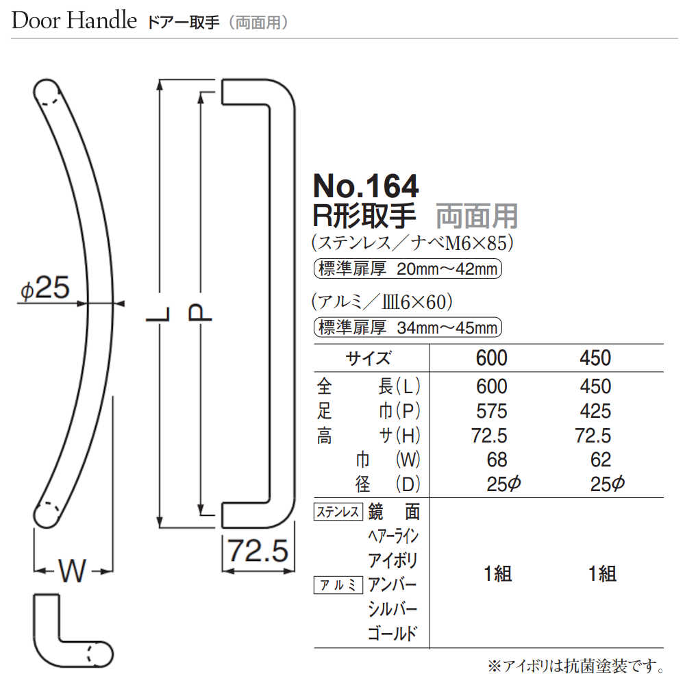 商品名ドアー取手標準扉厚34mm〜45mm対応品番No.164   450 アンバー   600 アンバー   450 ゴールド   600 ゴールド   450 ヘアーライン   600 ヘアーライン   450 アイボリ   600 アイボリ   450 鏡面磨   600 鏡面磨   450 シルバー   600 シルバー