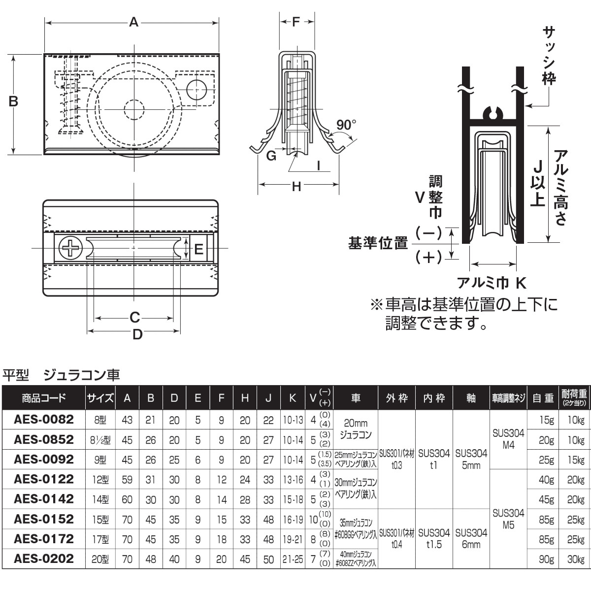 品名サッシ取替戸車車形状平型仕様ジュラコン(R)車※ジュラコン(R)は、ポリプラスチックス株式会社が日本その他の国で保有する登録商標です。対応品番AES-0082 平型 8型AES-0852 平型 8 1/2型AES-0092 平型 9型AES-0122 平型 12型AES-0142 平型 14型AES-0152 平型 15型AES-0172 平型 17型AES-0202 平型 20型