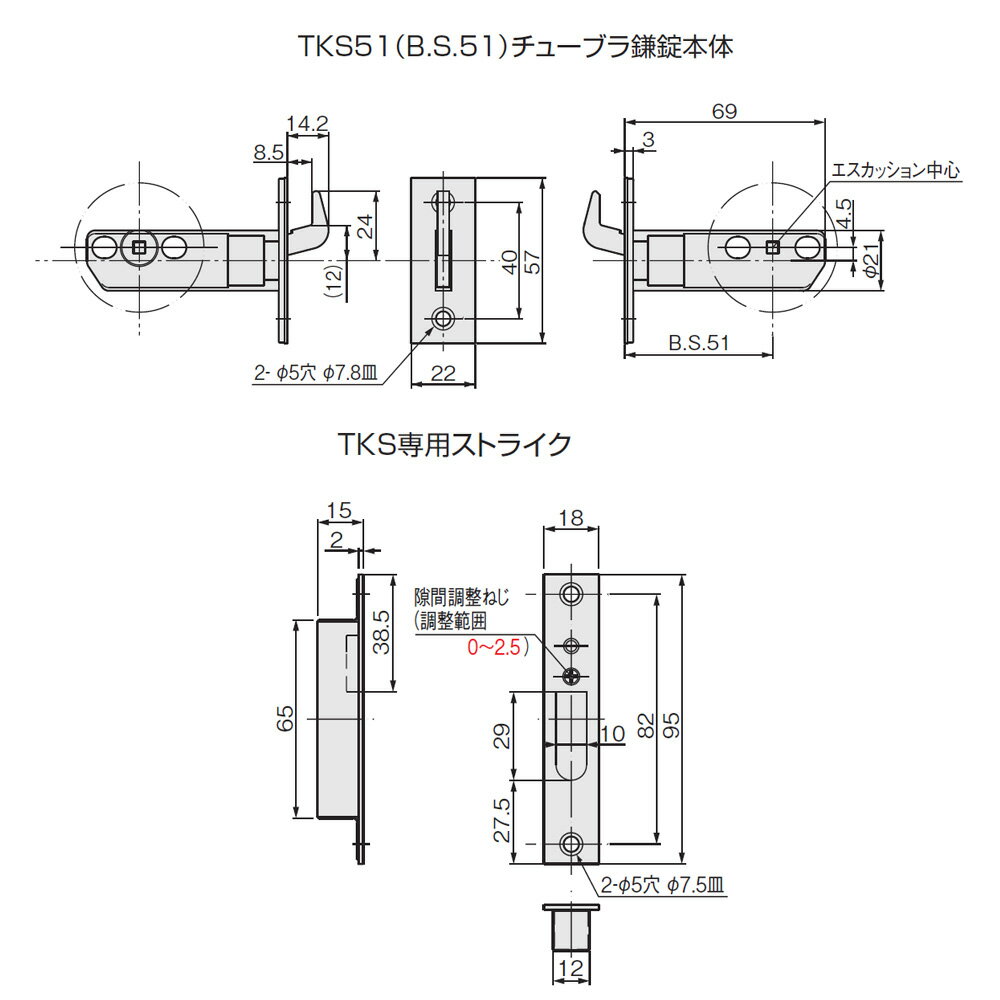 メーカー名アトムリビンテック商品名TKS51チューブラ鎌錠 FCT シリンダー/サムターン品番TKS51-FCT使用条件一般住宅屋内用木製引戸(玄関や屋外、浴室では使用しないでください) ◇対応戸厚:28mm?36mm(FCTとCYTは30mm?36mm)特徴●掘込み加工が容易なチューブラ鎌錠です。 ●掘込み径φ21mmの細型です。●戸と枠の間の隙間をドライバー1本で調整できます。●サムターンとセットになったシリンダー錠です。鍵違いは52通りです。●シリンダーとサムターンはフラットなので、戸袋でも対応可能です。●バックセット51mmのみの対応となります。仕上WBメッキ材質エスカッション:アルミ合金サムターン、シリンダー:亜鉛合金キー:真鍮※ご注意「キー別番」でご注文の場合、鍵番号はランダムに出荷されます。