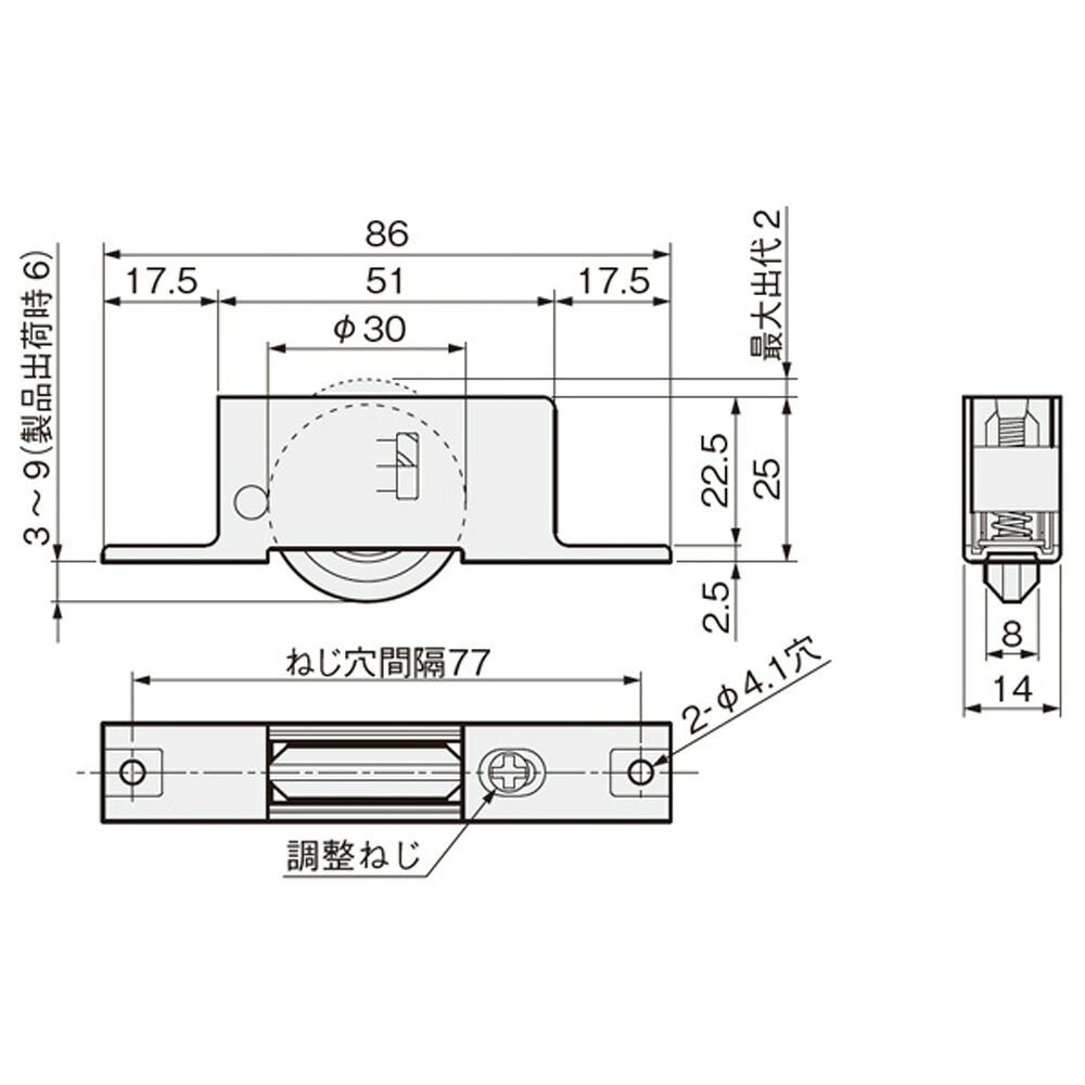 メーカー名アトムリビンテック商品名DS調整戸車(φ30mmV型調整戸車)品番DS調整戸車-B 30V(ベアリング入り)DS調整戸車-O 30V(ベアリングなし)特徴●戸を上下方向に調整できます。上下方向の調整は、出荷時より上下に±3mmです。 ●車輪には、摺動性の良い樹脂を使用しています。使用条件一般住宅屋内用木製引戸(浴室には使用できません) ◇引戸の総質量:(引戸1枚、戸車2ヶ使用) DS調整戸車-B 30V(ベアリング入り):40kg以下 DS調整戸車-O 30V(ベアリング無し):20kg以下 ◇対応レール: CVレール、AVEDレール、AVYDレール、ツバ無しVレール、ウイングレール材質車輪:POM ケース:鋼添付品皿タッピンねじ3×20 2本サイズ30V車輪形状ベアリング入りφ30mmV型ベアリングなしφ30mmV型仕上車輪:白 ケース:ユニクロ